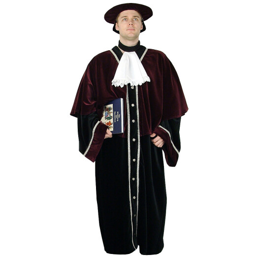 Dieser Renaissancetalar ist für gelehrte Bürger und Universitätsleute bestimmt. Als Material wurde Samt eingesetzt. Der Unterrand der Ärmel und die Pelerine vorn sind mit geflochtener Borte mit Metallfaser gesäumt. Zum Renaissancetalar werden auch Fichu und ein Hut, auch Birett genannt, mitgeliefert. Weitere Produktinformationen ...