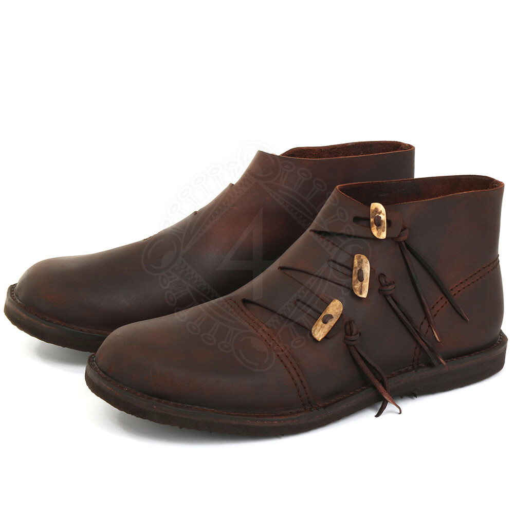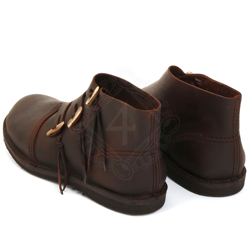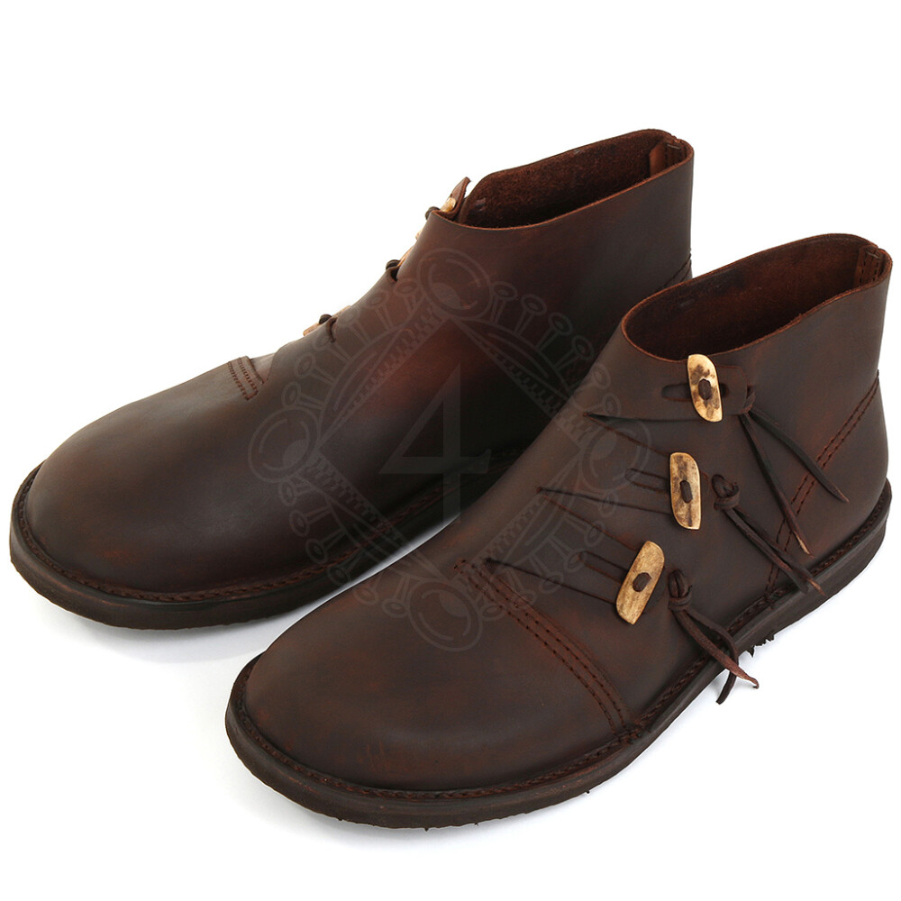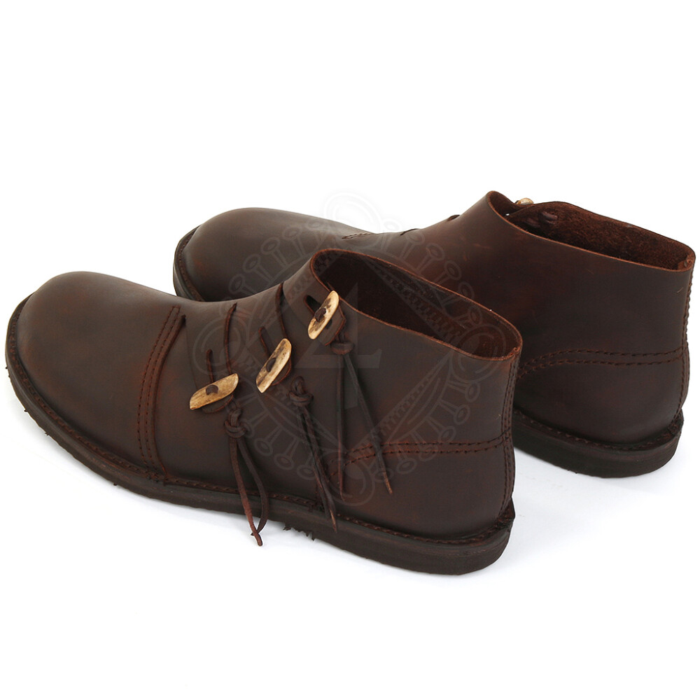 Diese Wikingerschuhe sind datiert ins 8.-12. Jahrhundert. Sie wurden nach einem Fund bei Hedeba gefertigt. Die lederne Knöchelschuhe sind mit den Zierschlitzen verziert. Die Zierschlitzen sind ein Bestandteil des Knopfverschlussess. Weitere Produktinformationen ...