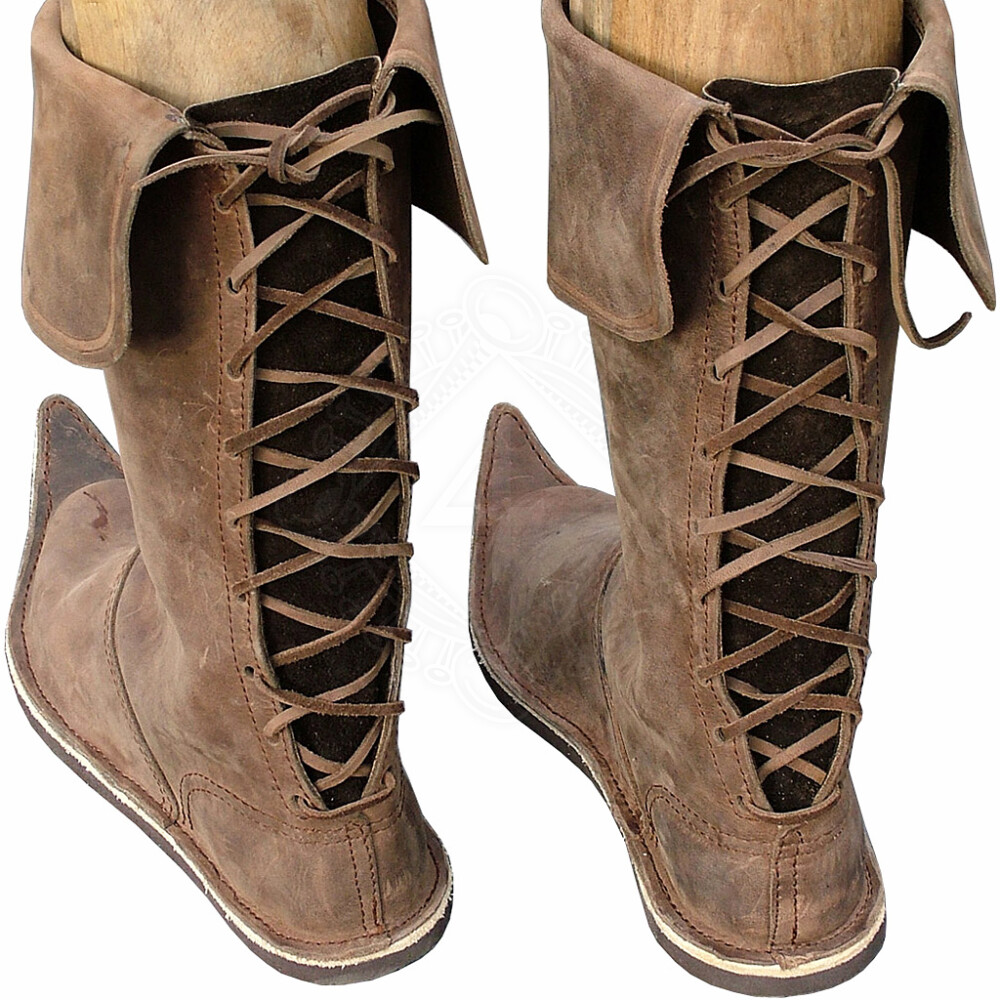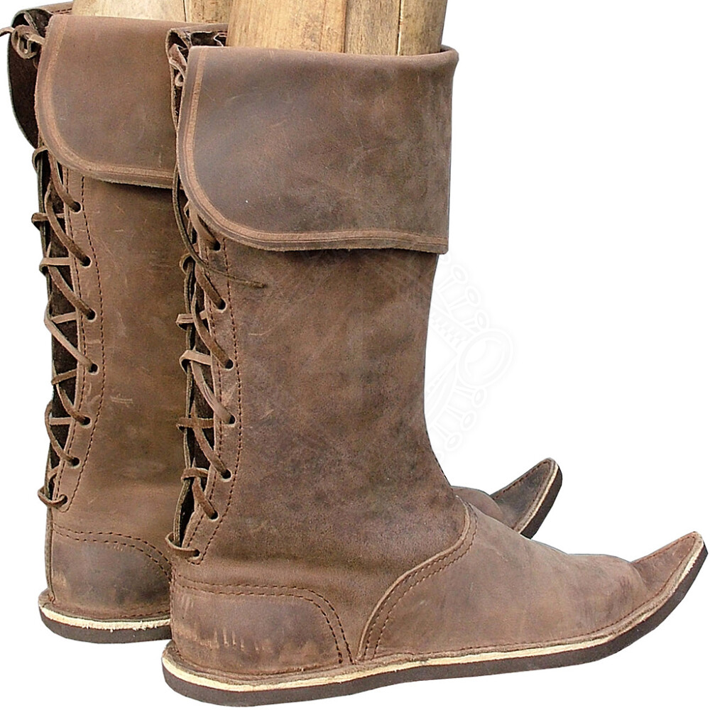 Diese Piratenstiefel Black Bart werden genau nach den Maßen des Kunden aus echtem Rindsleder handgefertigt. Sie haben widerstandsfähige Gummisohlen. Es handelt sich um ein gelungenes und bewährtes Modell für LARP und mittelalterliche Events. Diese Piratenstiefel passen fantastisch zu vielen mittelalterlichen Kostümen aus der Zeit 12.- 15. Jahrhundert. Die Rückenschnürung erlaubt die Stiefel individuell Ihrer Wadengröße noch anzupassen. Die Piratenstiefel werden ein Blickfang Ihrer Bekleidung. Es ist manchmal schwierig, ein passendes Modell mittelalterlicher Schuhe zu Ihrem Kostüm zu finden, Unser Model passt zu einer breiten Skala mittelalterlichen Kostümen. Weitere Produktinformationen ...