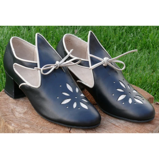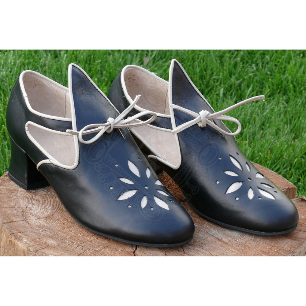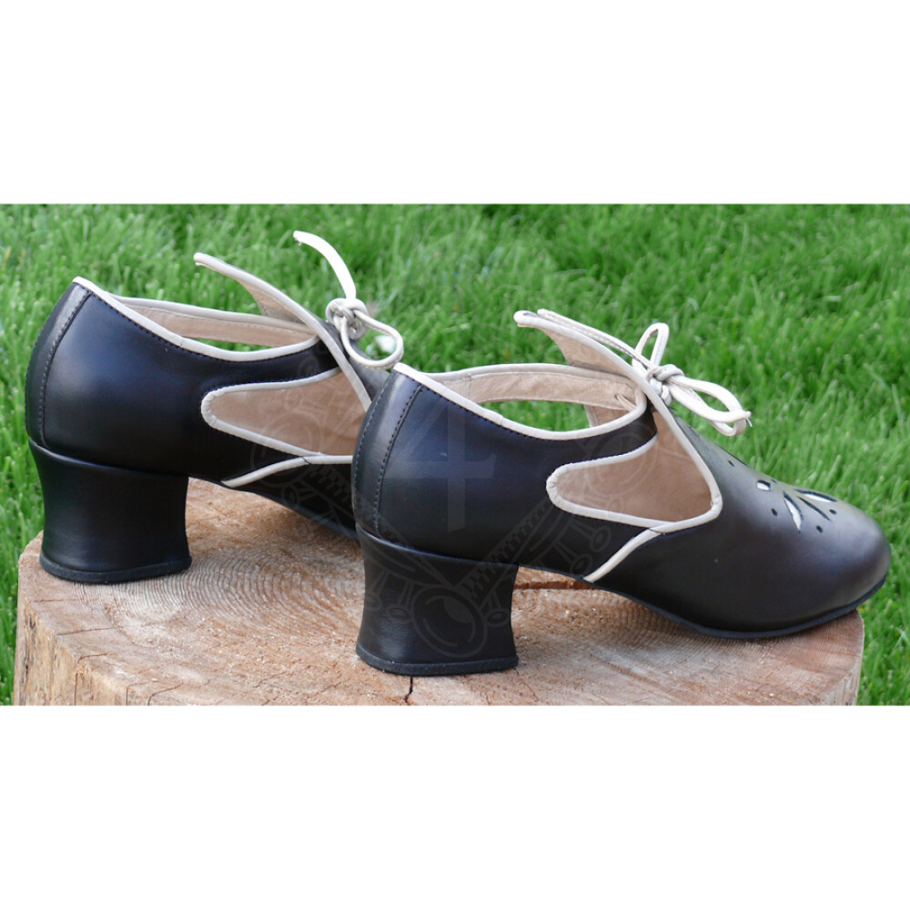 Die Damenschuhe im Stil des Barocks haben einen höheren Absatz und sind mit den Schlitzen und mit der Schleife verziert.