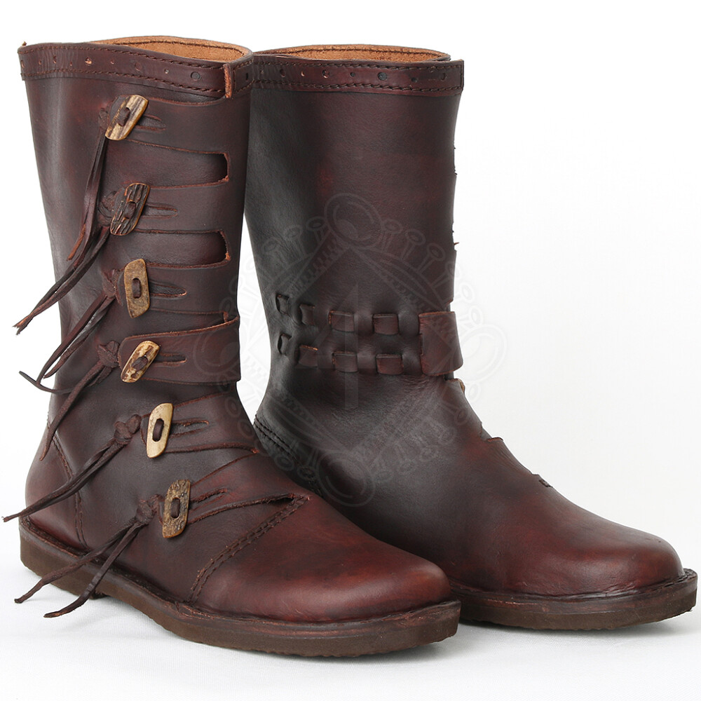 Die lederne Knöchelschuhe sind mit den Lederfahnen verziert. Die Lederfahnen sind ein Bestandteil des Knopfverschlusses. Wikingerschuhe, Gesamthöhe ca. 29cm.