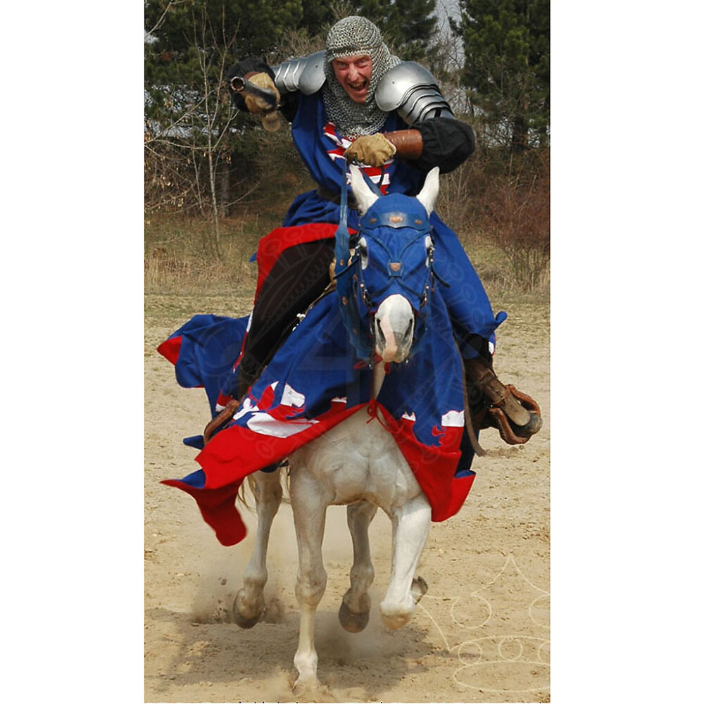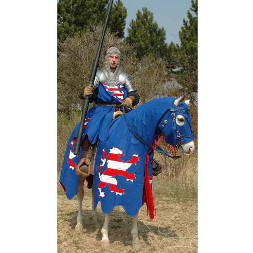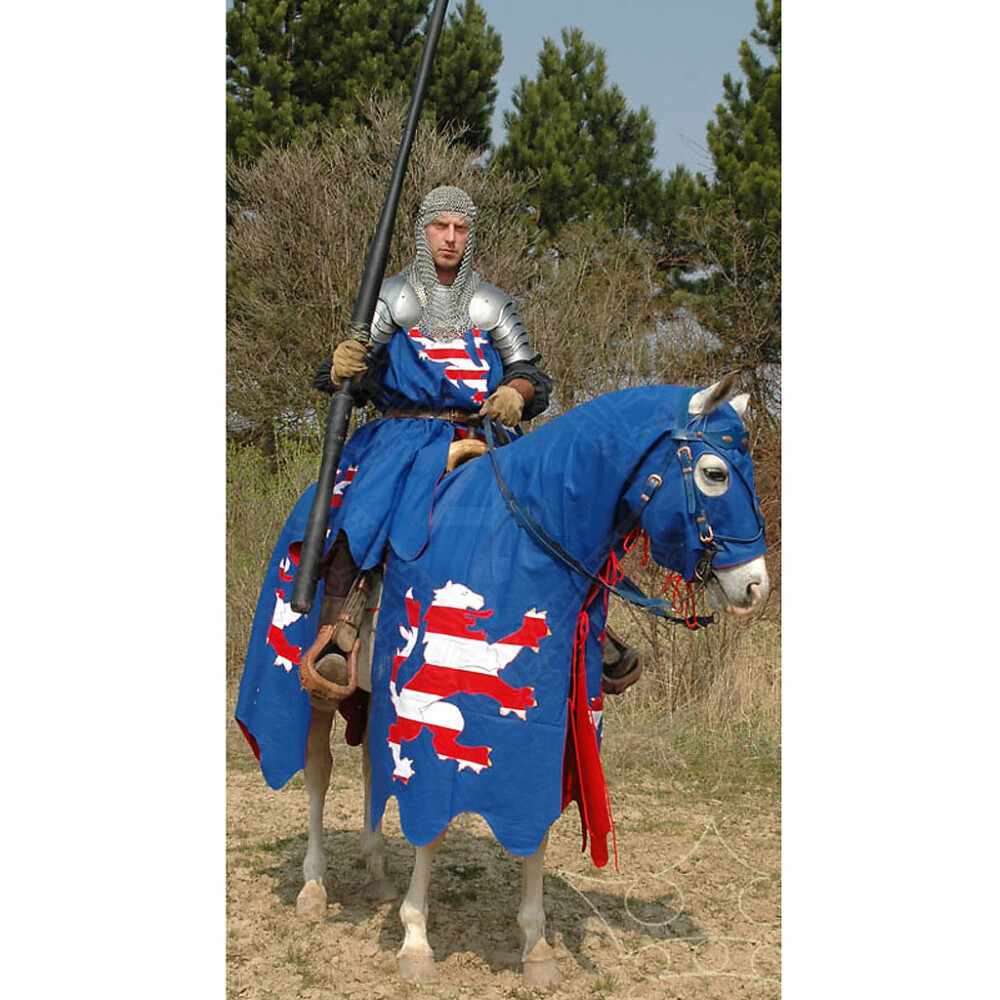 Die Ritterausstattung besteht aus einem Waffenrock (genannt auch Wappenrock) einer beidseitiger Fahne (genannt auch Banner) und einer Pferdedecke (genannt auch Schabracke). Die Ganze Ausrüstung ist beiderseitig gefertigt aus Baumwolle und mit dem Löwenwappen verziert. Man zieht den Waffenrock über die Rüstung an. Der ärmellose Waffenrock hat einen Zierbesatz. Weitere Produktinformationen ...