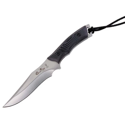 Typhoon ist eine weitere Military Serie entwickelt vom Qualitätshersteller Muela aus Spanien. Das Messer hat ein gutes Größenverhältnis zwischen Griff und Klinge. Die Klinge ist aus rostfreiem Molybdän-Vanadium-Stahl, geht voll bis zum Griffende durch und hat dort eine Öse für einen Fangriemen. Als Griffschalen sind robustes Micarta aufgeschraubt.  Weitere Produktinformationen ...