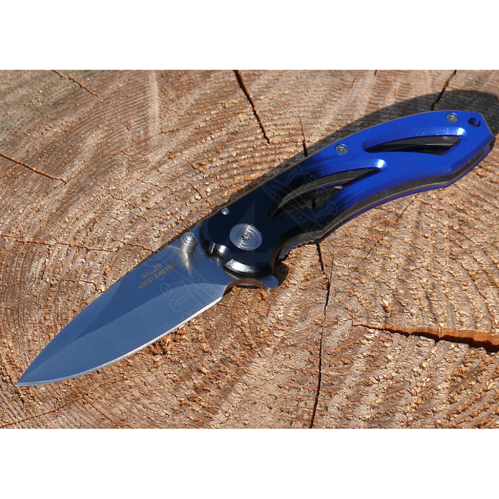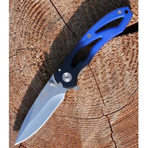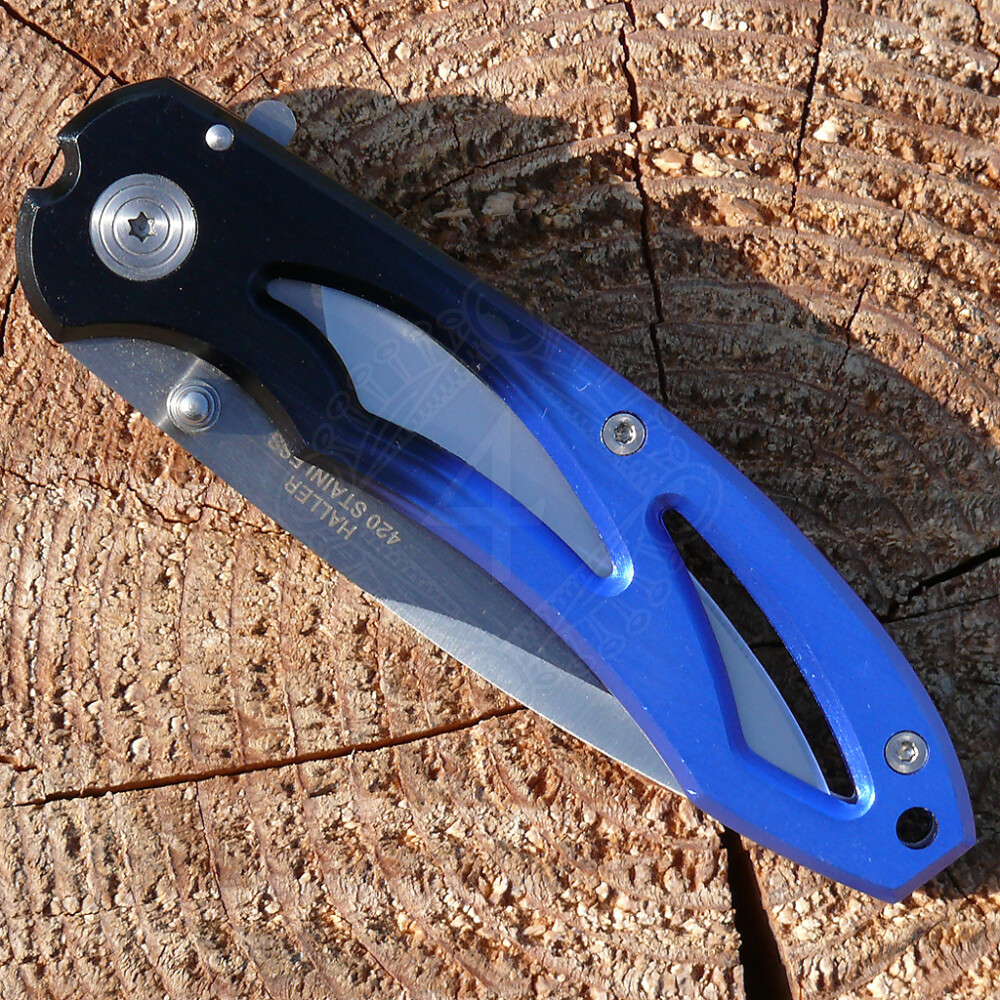 Die Klinge ist sandgestrahlt. Der Griff aus Leichtmetall wurde in einem Verlauf von Schwarz zu Blau eloxiert, mit Clip. Weitere Produktinformationen ...