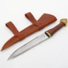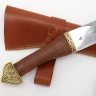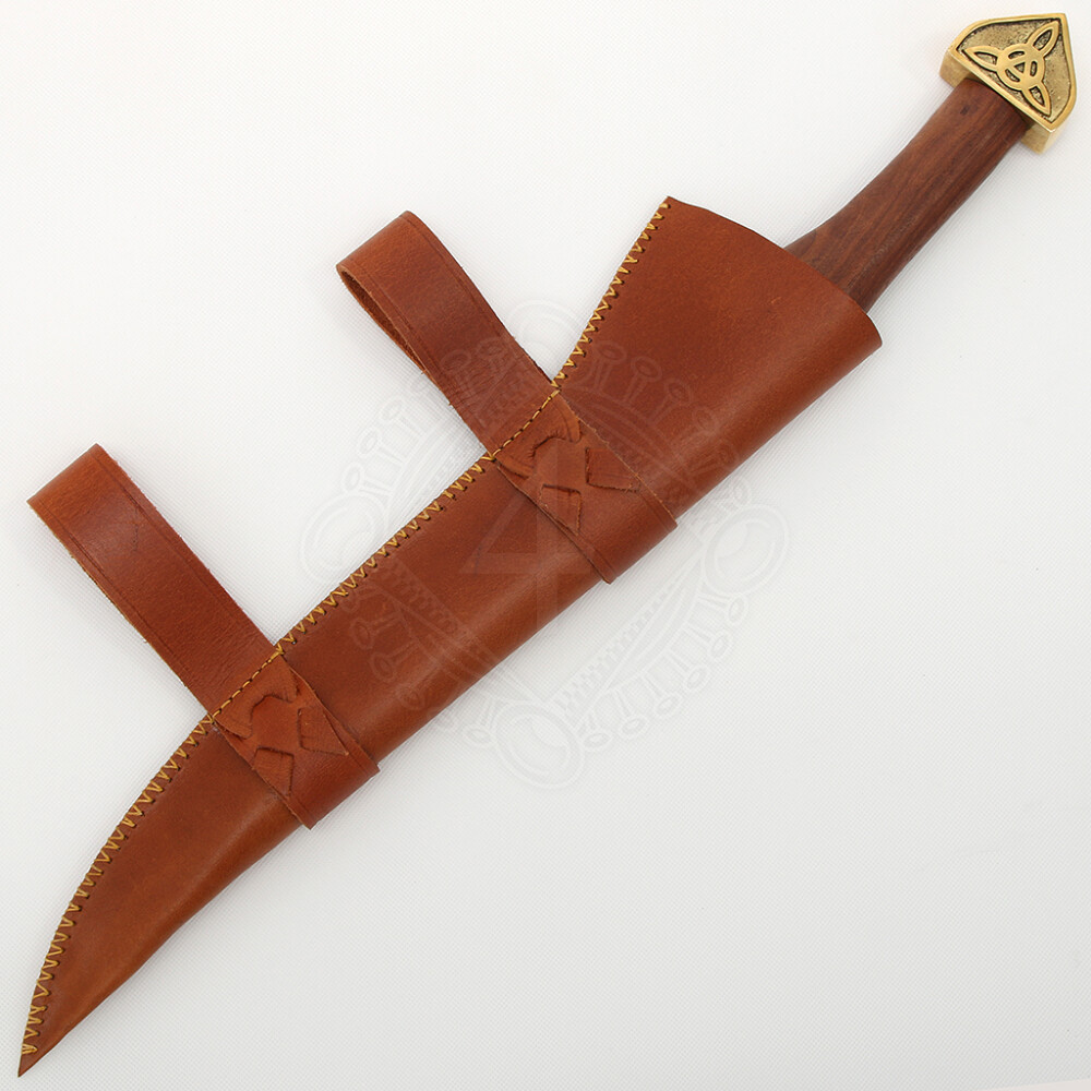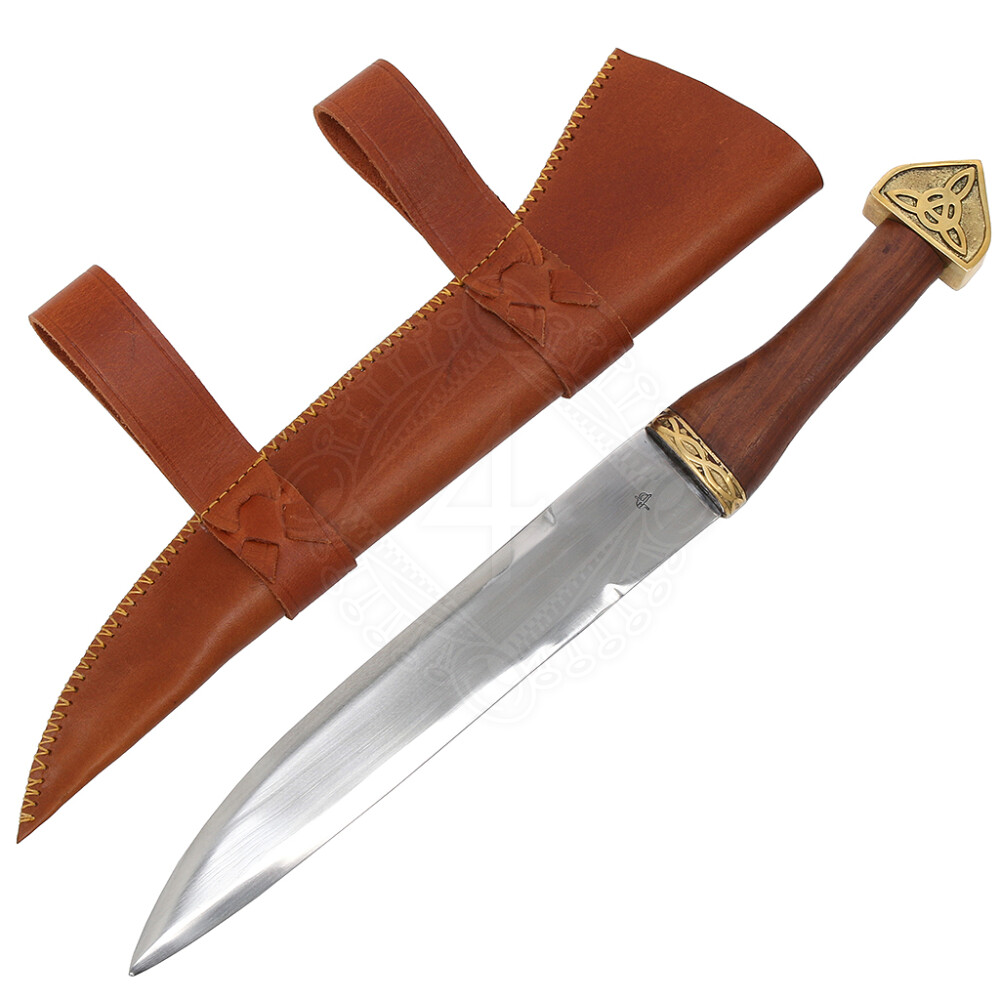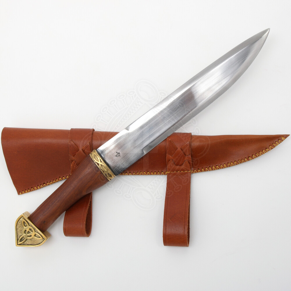 Saxmesser Jarlath mit geschmiedeter Messerklinge aus Kohlenstoffstahl. Dieses Messer wurde waagerecht getragen. Am Griff sind dekorative metallverzierungen. Zu dem Saxmesser gehört eine kräftige, braune Lederscheide. Weitere Produktinformationen ...