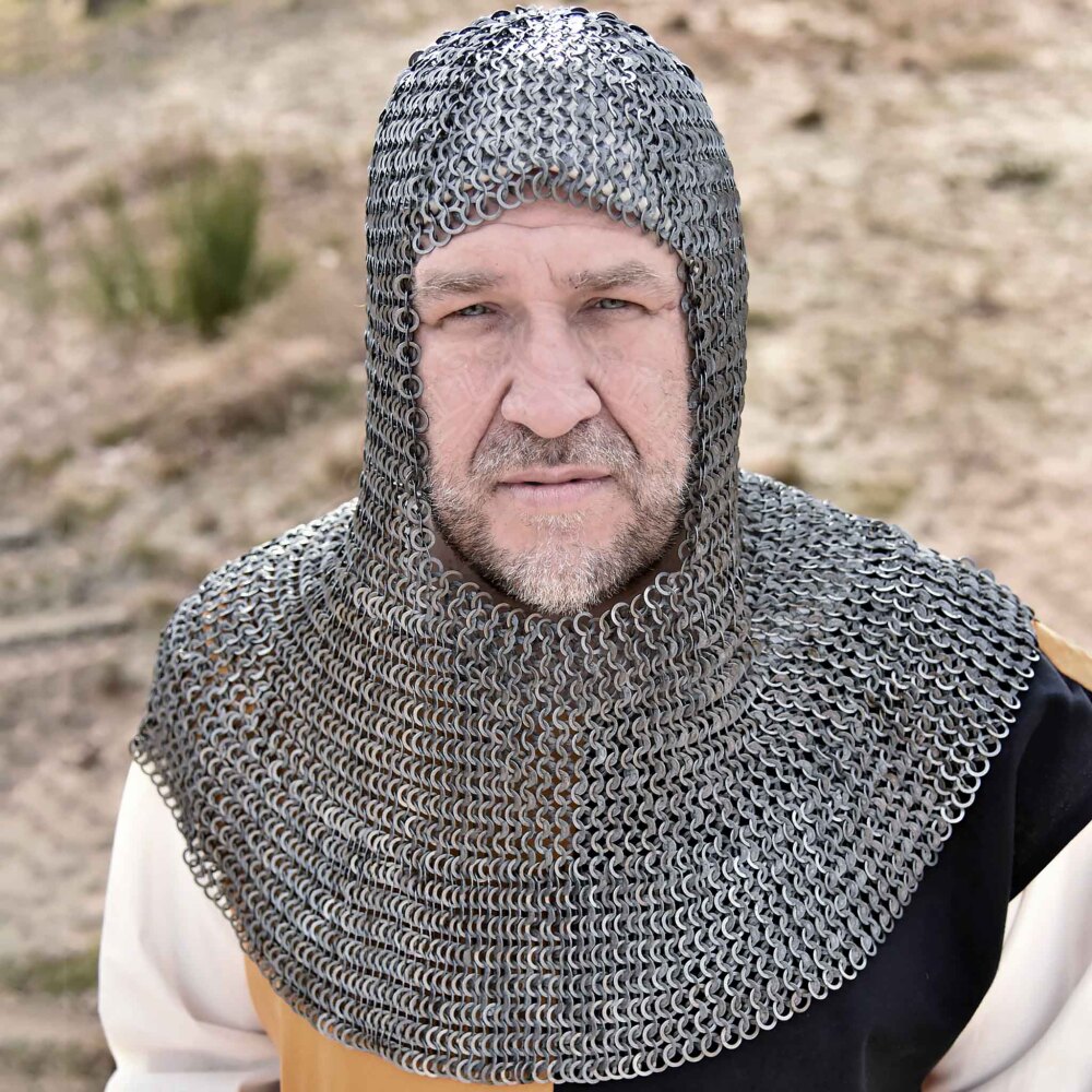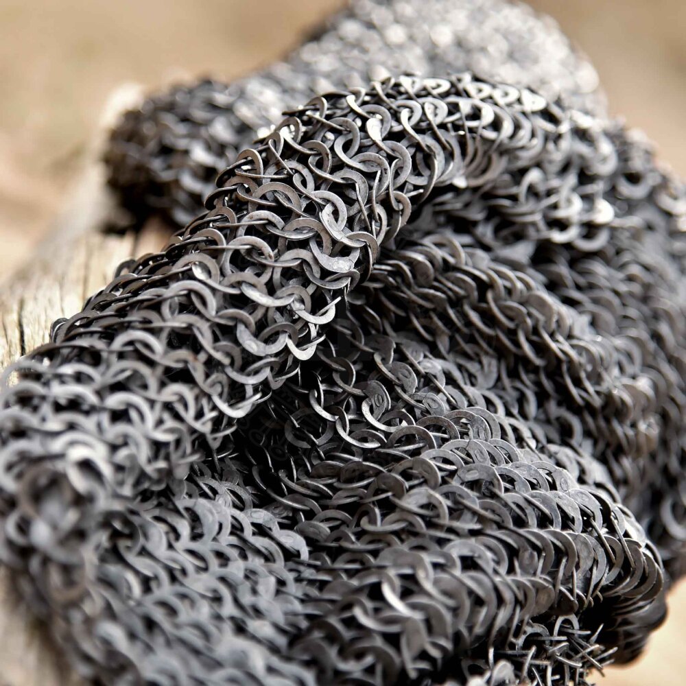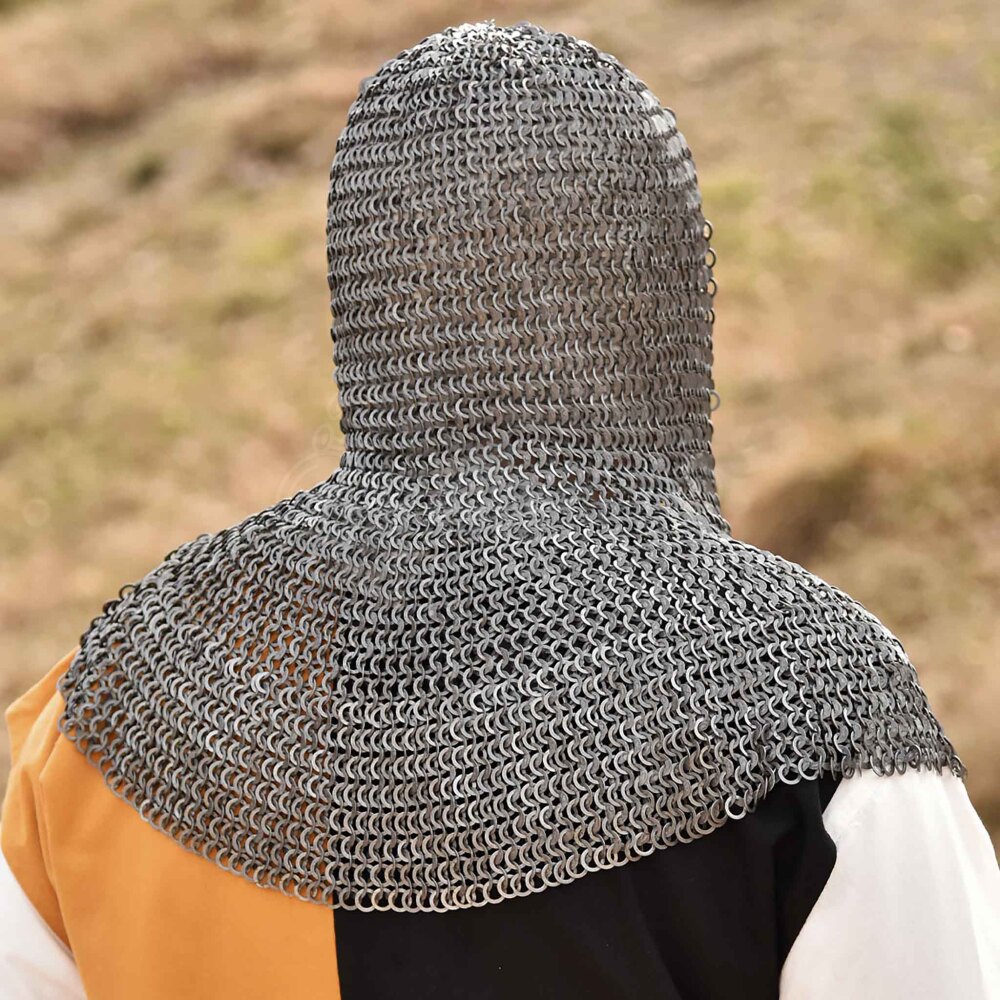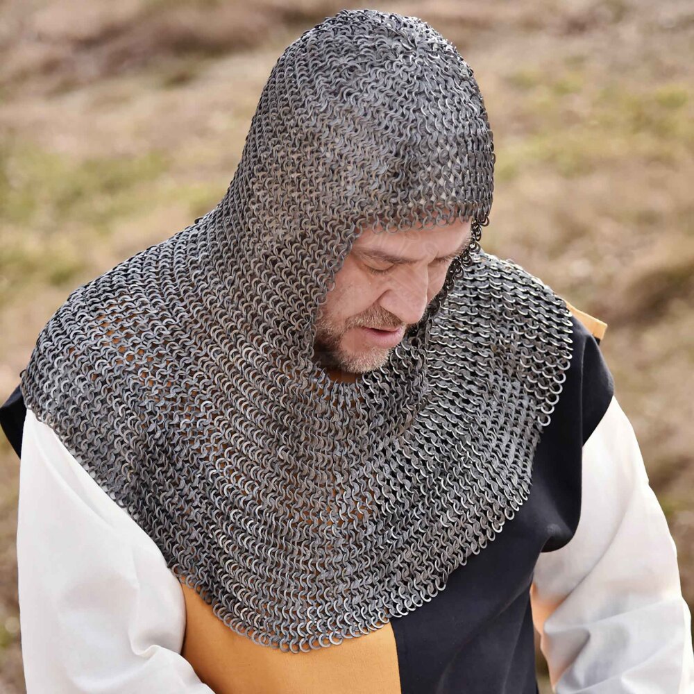 Spätmittelalterliche Kettenhaube aus Flachringen, vernietet mit Keilnieten