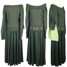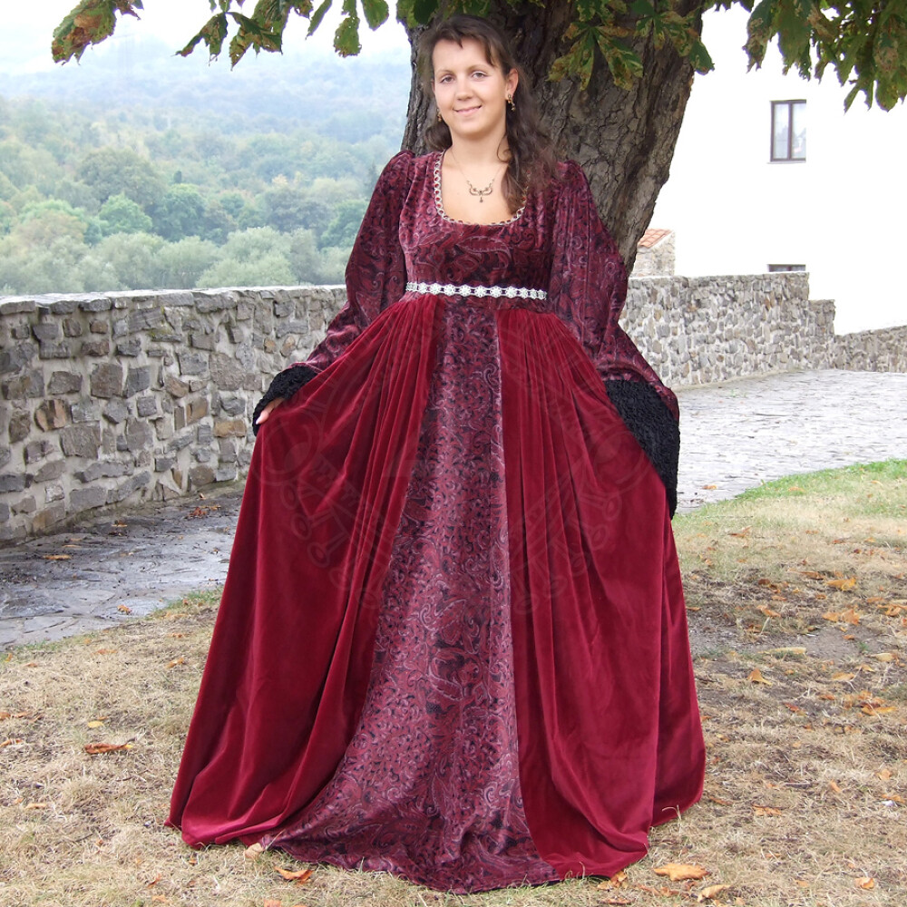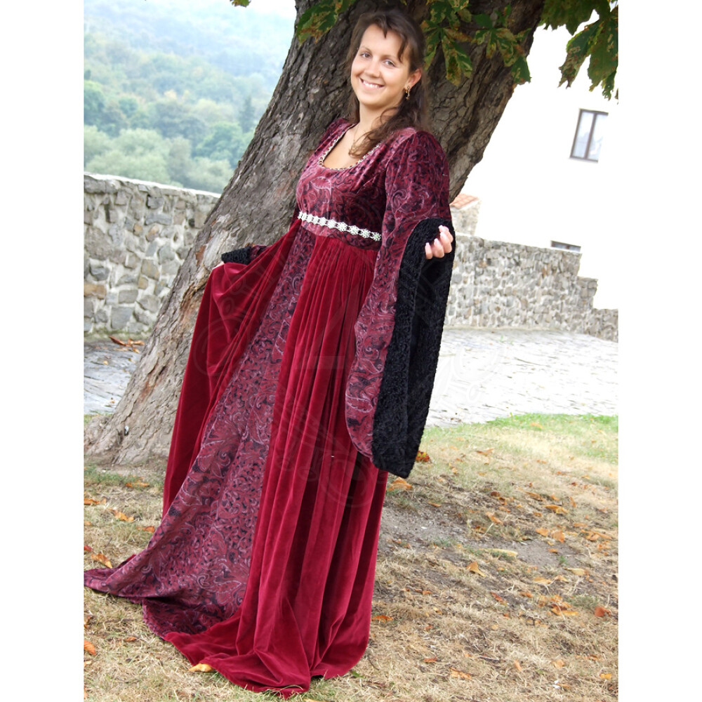 Dieses prachtvolle Damenkleid ist im Stil der burgundischen Mode gehalten. Das enganliegende Mieder geht in einen weiten Rock über und hat einen Einsatz in einer anderen Farbe am Vorderteil. Der viereckige Ausschnitt ist mit künstlichen Edelsteinen verziert. Die Ärmel sind weit, gesäumt mit künstlichem Pelz (100% PAD). Diese Mittelalterliche Kleidung Zelda ist aus Samt (100% Baumwolle). Unter der Brust befindet sich ein Gürtel. Weitere Produktinformationen ...