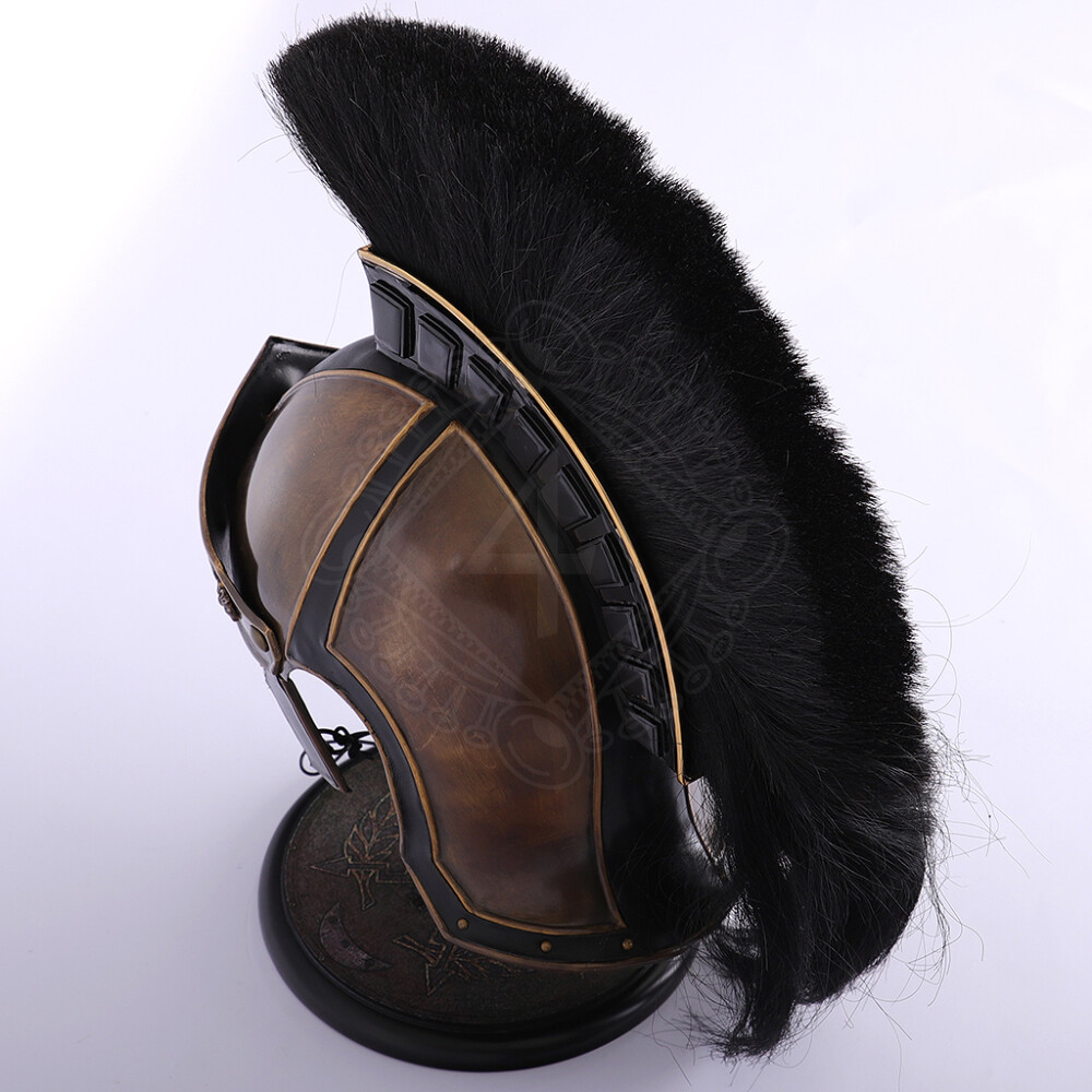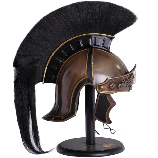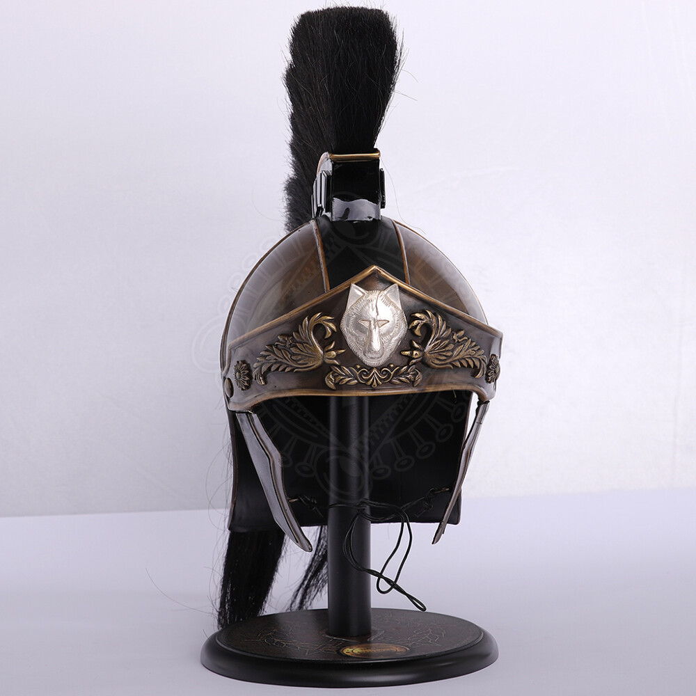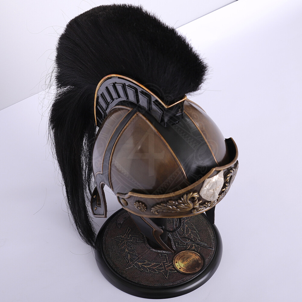 1xDer Gladiator Helm von General Maximus ist handgetriebenem Stahlblech gefertigt und mit Messing beschichtet. Er verfügt über einen echten Rosshaarkamm und verstellbares Lederfutter. Dieser Gladiatorenhelm ist sicher eines Römischen Generals würdig. Ein versilberter Wolfskopf ist an der Stirnplatte befestigt. Das innere Lederfutter machen diesen Helm atemberaubend praktisch. Weitere Produktinformationen ...