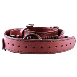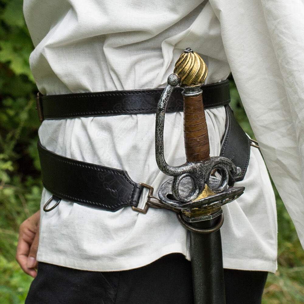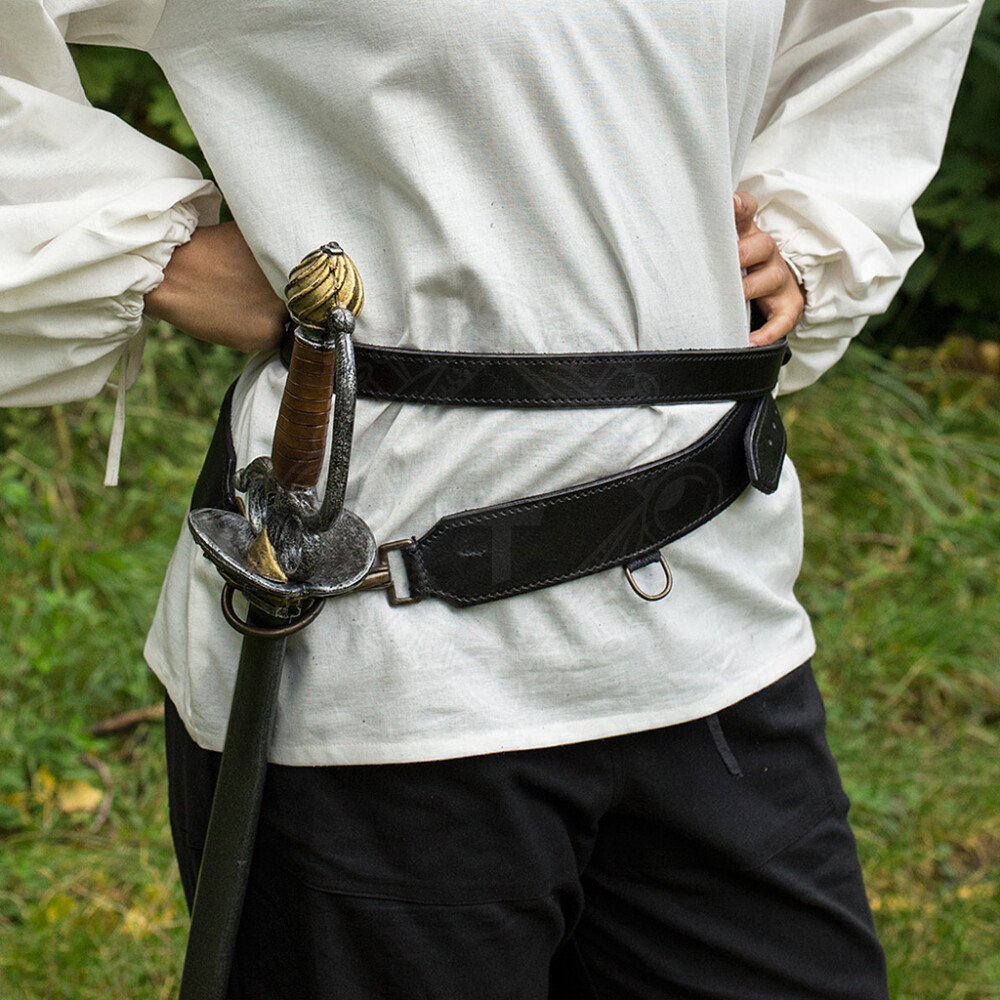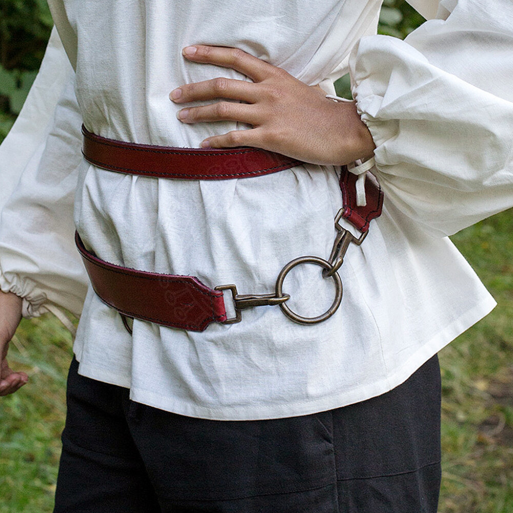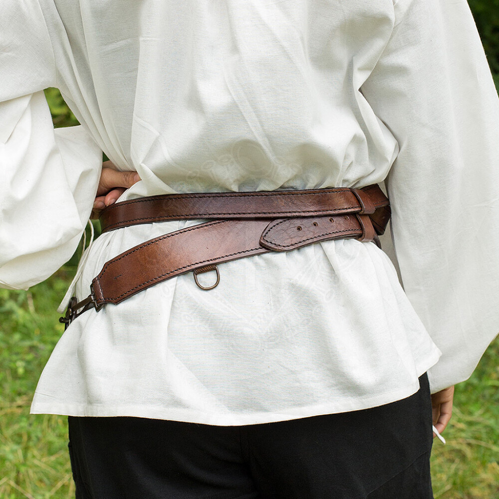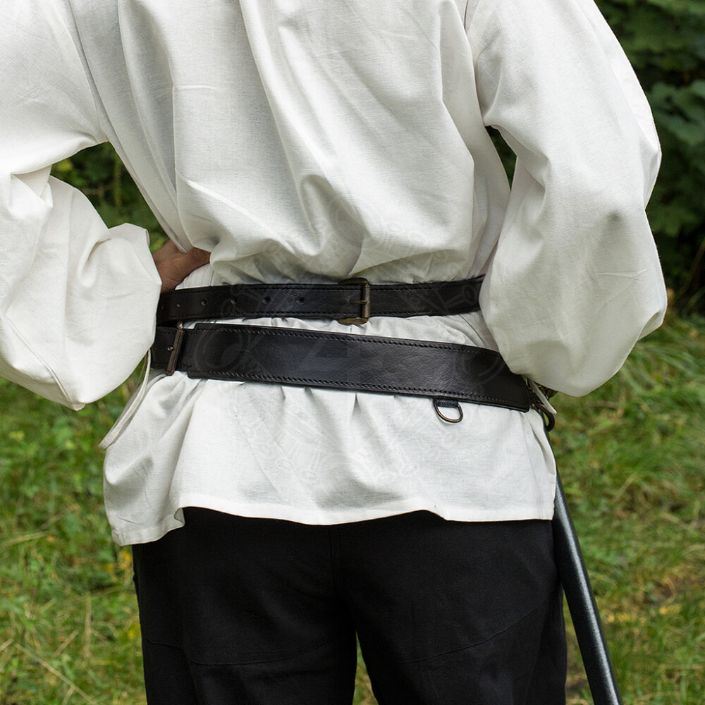 Ein zweireihiger Schwertgürtel aus hochwertigem gefärbtem Rindsleder. Der obere, schmale Gürtel ist ca. 3cm breit und wird um die Hüfte geschnallt. Der ca. 5cm breite untere Gürtel ist länger und hängt bequem etwas tiefer. An diesem sind zwei D-Ringe sowie ein von zwei Karabinern gehaltener Ring befestigt, an denen eine Schwertscheide o.ä. individuell befestigt werden kann. Weitere Produktinformationen ...