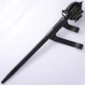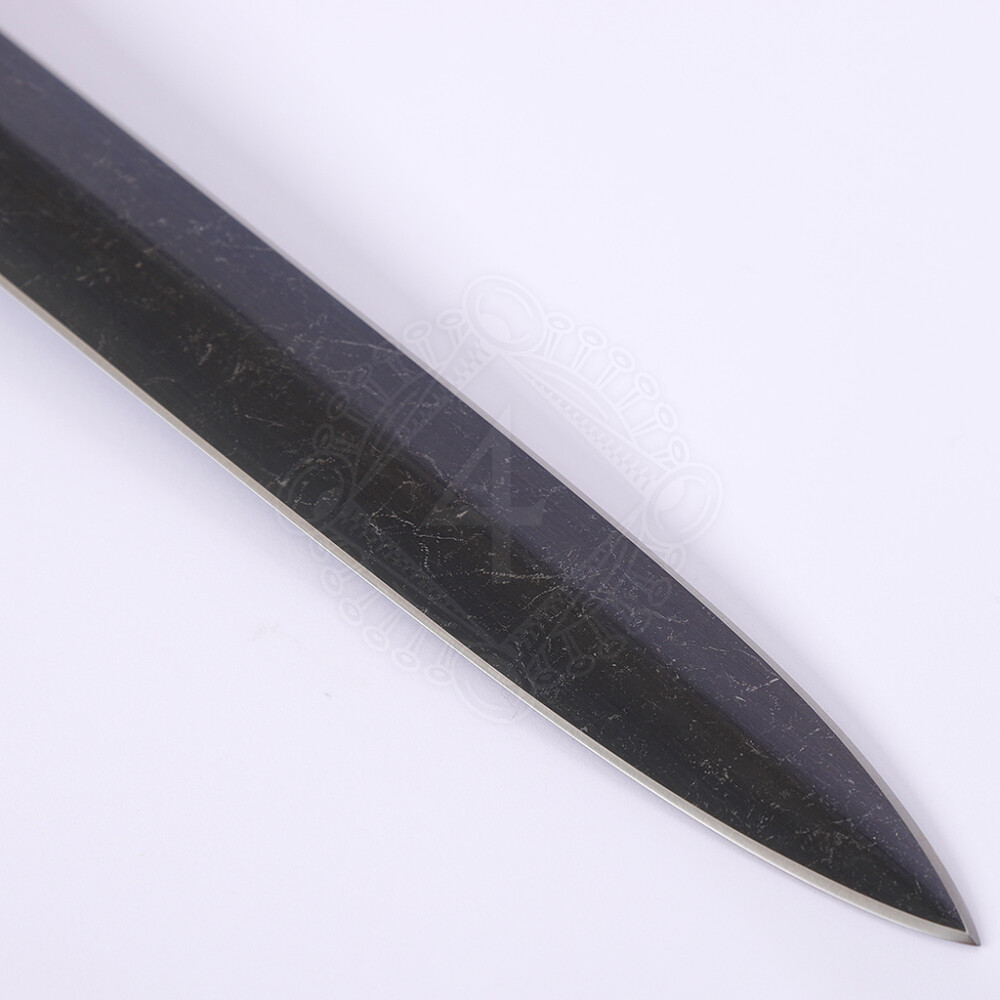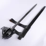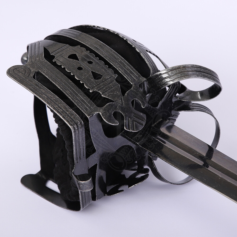 Diese Battlecry-Version basiert auf einem Korbschwert, das im Jahre 1746 bei der Schlacht von Culloden eingesetzt werden konnte. Die Klinge besteht aus 1065 Hartstahl, der zusammen mit den Griffbeschlägen mit der dunklen, patinierten Oberfläche versehen wurde. Der filigrane Stahlkorb ist mit runden und rautenförmigen Ausschnitten und fachmännisch ausgeführten Rillen verziert. Der Holzgriff ist mit echter Rochenhaut und einem dekorativen metalldraht silbernen Farbe festgebunden. Der Korb in innen mit schwarzer Wolle ausgehleidet.