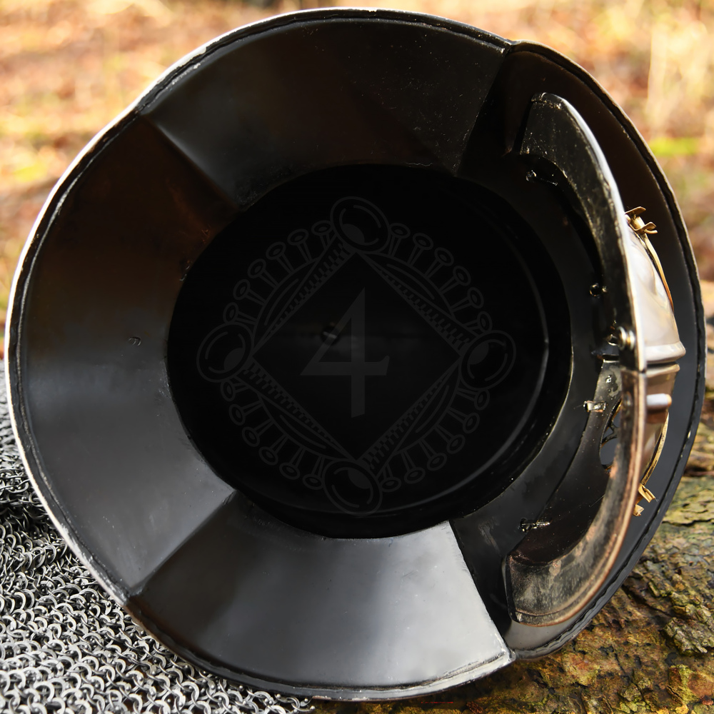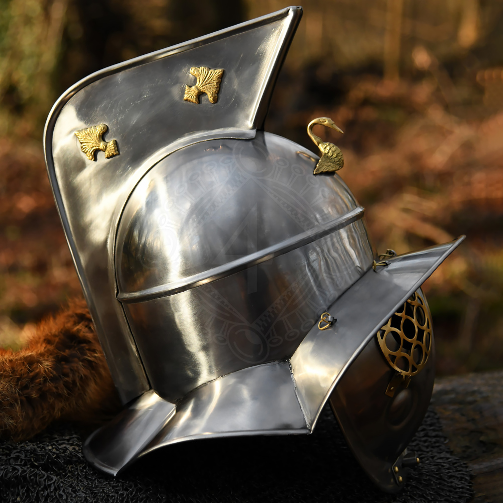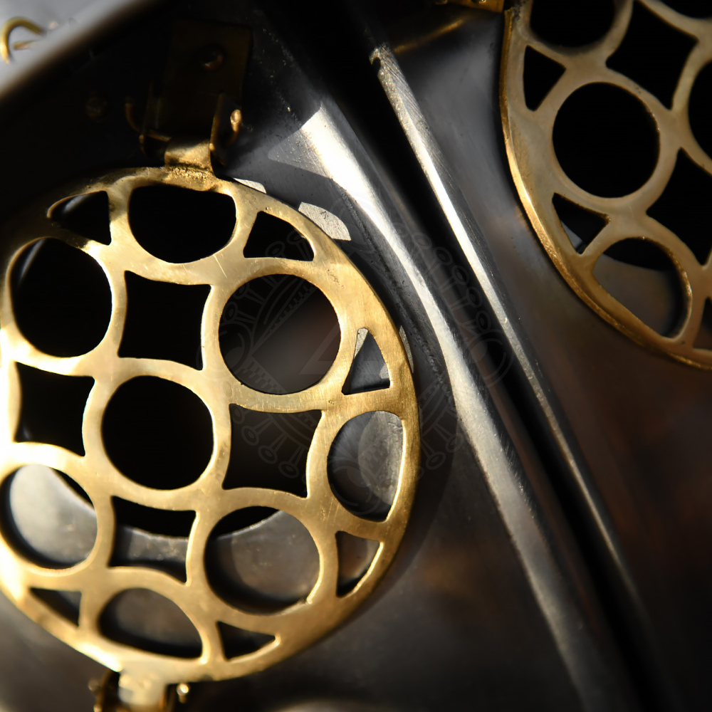Diese Reproduktion ist aus hochwertigem Stahl gefertigt und mit diversen messingfarbenen Applikationen am charakteristischen Helmkamm und der Stirn verziert. Der Gesichtsschutz ist an drei kleinen Scharnieren aufgehängt und mit einem drehbaren Verschluß zu sichern. Eine gepolsterte Haube ist im Lieferumfang enthalten.