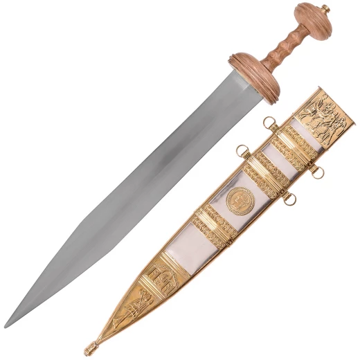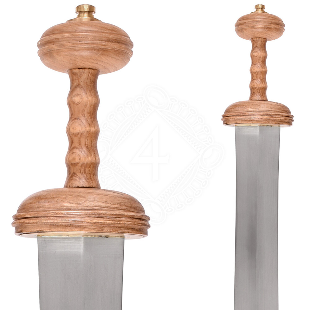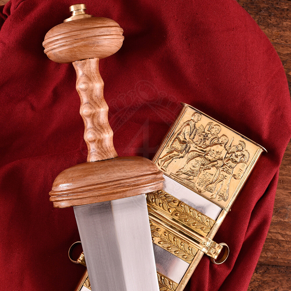 Diese Nachbildung besitzt eine Klinge aus EN45 Federstahl, welche nicht geschärft ist. Der Griff sowie der Knauf sind aus Holz gefertigt. Die Schwertscheide besteht aus Metall und besitzt aufwendig verzierte Messingund Blechbeschläge, welche die römischen Kaiser Augustus und Tiberius zeigen, sowie Tragringe an den Seiten der Scheide.
