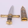 Der Dekorative Dolch Salomonssiegel verfügt über eine Klinge aus Edelstahl, andere Teile sind aus gegossenem Metall gelber Farbe und Kunststoff - Lederimitat. Sie erhalten sogar die wunderschön gearbeitete Scheide aus Metall. Weitere Produktinformationen ...