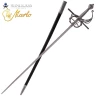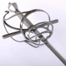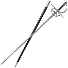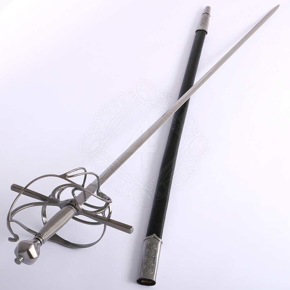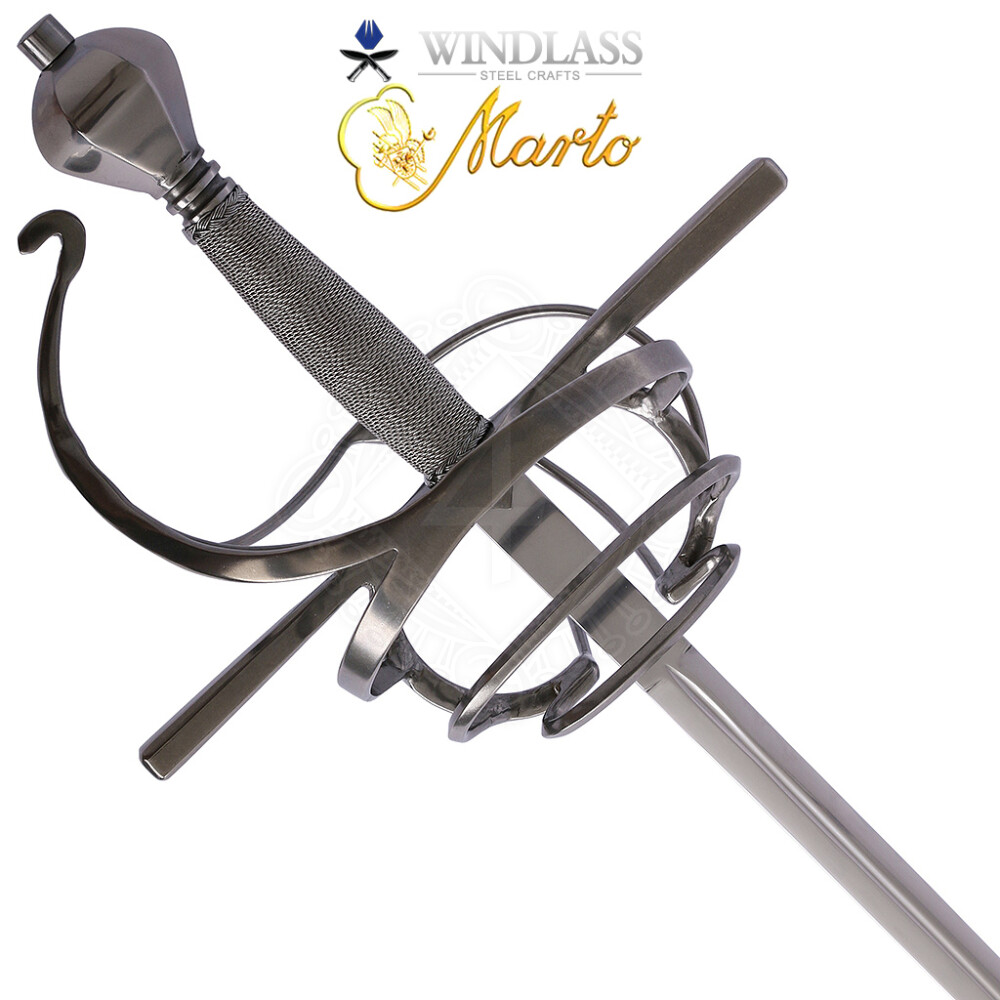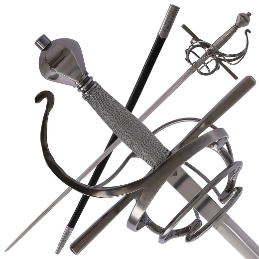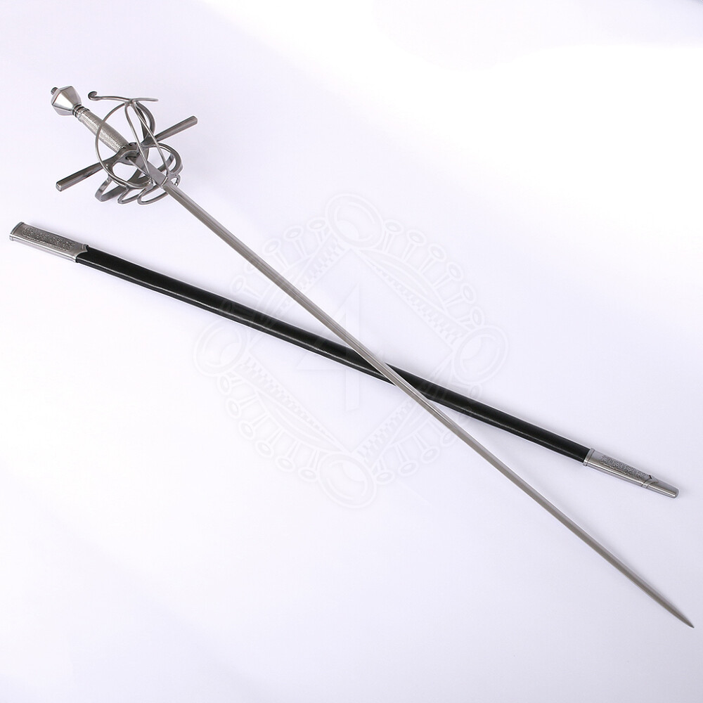 Ein wunderschön ausgeführtes Rapier aus dem 17. Jahrhundert mit sehr komplexem Gefäß und facettiertem Knauf. Der Griff ist umgewickelt mit versilbertem Draht und mit Drahtkränzen an seinem Anfang und am Ende. Die handgeschmiedete, ganz temperierte Klinge aus kohlenstoffhaltigem Hartstahl verfügt über eine breite Hohlkehle. So ist die Klinge leichter und trotzdem genug Stark zum Stechen. Die robuste Fehlschärfe verleiht dem Hauptspannungsbereich zusätzliche Festigkeit. Die Klinge hat eine fein geschliffene Spitze, so ist sie Optimal zum Stechen. Die hochwertige Scheide aus echtem Rindsleder verfügt über tief eingravierte florale Muster am Mundblech und Ortband. Diese Art von Rapieren war tödlich wirksam als Duellwaffe. Diese einzigartige Waffe aus dem 17. Jahrhundert wurde von Bruce Brookhart entworfen und seinem Freund Hank Reinhardt gewidmet. Weitere Produktinformationen ...