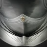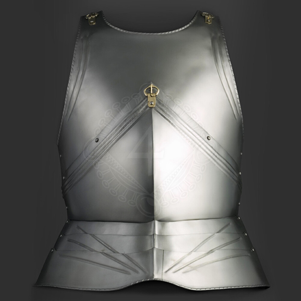 Dieser Harnisch zeichnet sich durch seine Kannelierungen (senkrechte Rillen) und die V-förmige Verstärkung auf der Brust aus. Dieses typisch deutsche Design sieht nicht nur elegant aus, sondern versteift das Material und lässt Hiebe besser abgleiten. Ein weiteres Highlight ist der bewegliche Bauchschutz (Fauld/Bauchange), der aus mehreren geschobenen Lamellen besteht. Diese Konstruktion garantiert dir Bewegungsfreiheit beim Reiten oder Laufen.