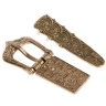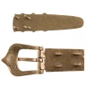 Die Schnallen-Platte hat kleine halbrunde Platten, mit denen die Schnalle auf das Ledergürtel zu befestigen ist. Das Lederriemen kann nach der Größe der Metallplatte geschnitten werden und dann zusätzlich vernäht oder vernietet, damit die Messingplatte viele Jahre an dem Ledergürtel hält.