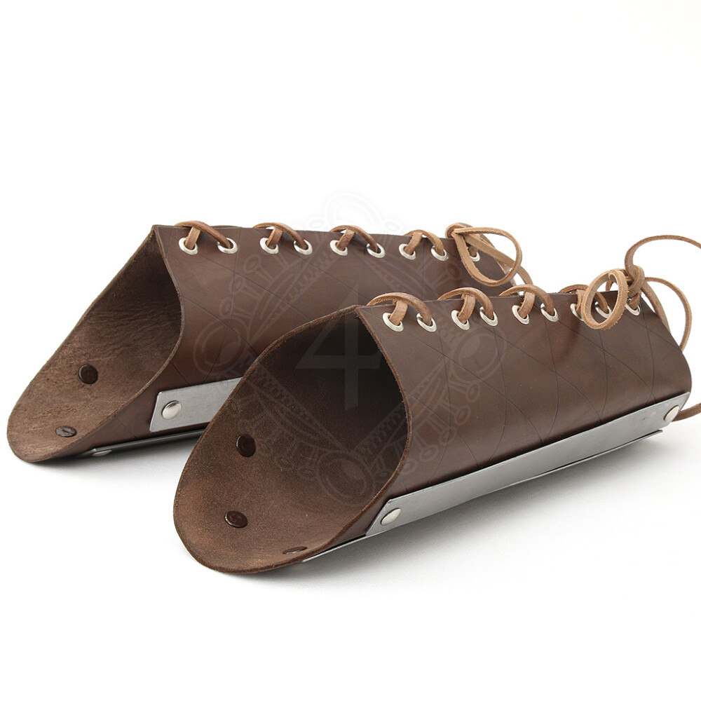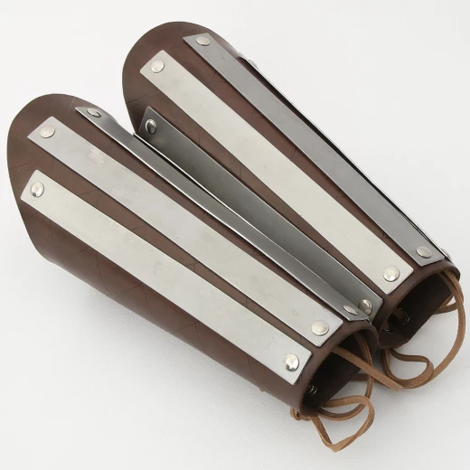 Diese Beinschienen waren bei den Wikingern insbesondere für ihre Einfachheit und Zweckdienlichkeit beliebt. Es wurde ein großer Wert auf Schutz der Schienbeine gelegt. Jeder Wikingerkämpfer hielt es für erforderlich, seine Beine gegen ungewünschte Schwertstreiche oder gegen andere Verletzungen zu schützen. Die beschlagenen Lederbeinschienen werden Ihre Beine sicher schützen.