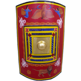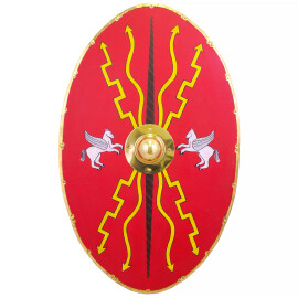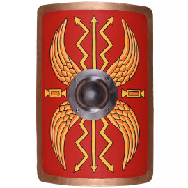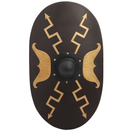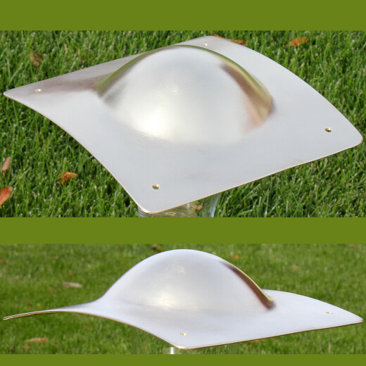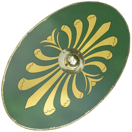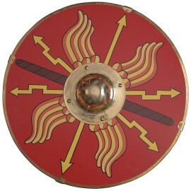 Unter einem Schildbuckel versteht man eine metallene Kalotte aus Eisen- oder Bronzeblech, welche ursprünglich zum Schutz der Faust auf der Vorderseite des Schildes aufgenietet war. Unter dem Buckel war im Schild ein Griffloch ausgespart, in dem der Träger den Schild an der Schildfessel führte. Verwendung fand der Schildbuckel beispielsweise beim römischen Scutum und bei den Rundschilden im Frühmittelalter. Nach der Einführung des sogenannten „Normannenschildes“ im 11. Jahrhundert, der eine andere Grifftechnik aufwies, kam dem Schildbuckel lediglich eine Dekorationsfunktion zu, bis er im Laufe des Hochmittelalters schließlich völlig verschwand. Weitere Produktinformationen ...
