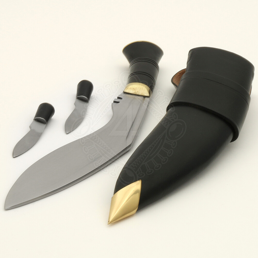 Mit diesem wuchtigen Hackmesser werden Gurkhas Offiziere in Indien ausgestattet. Der konturierte Griff besteht aus echtem Büffelhorn. Der Bart und Knauf sind aus Messing gefertigt. In der Lieferung sind zwei Kleine Messer als Zubehör enthalten. Weitere Produktinformationen ...