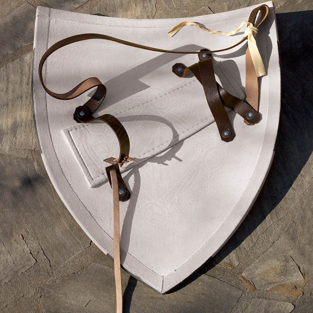 2xDer Schild verfügt rückseitig über zwei gekreuzte Handriemen aus Leder und einem ledernen Armriemen, der variabel mit der Hand gestrafft werden kann, was ein schnelles Loslösen vom Schild ermöglicht (wie beschrieben im "Codex Manesse"). Eine Schildfessel dient als zusätzliche Befestigung und zum Schutz vor Schlägen ist eine Armpolsterung angebracht. Weitere Produktinformationen ...