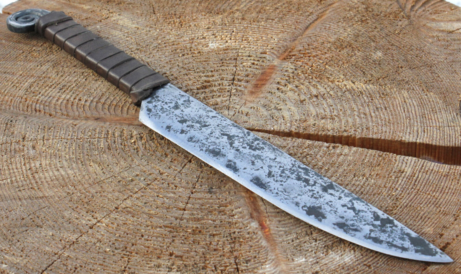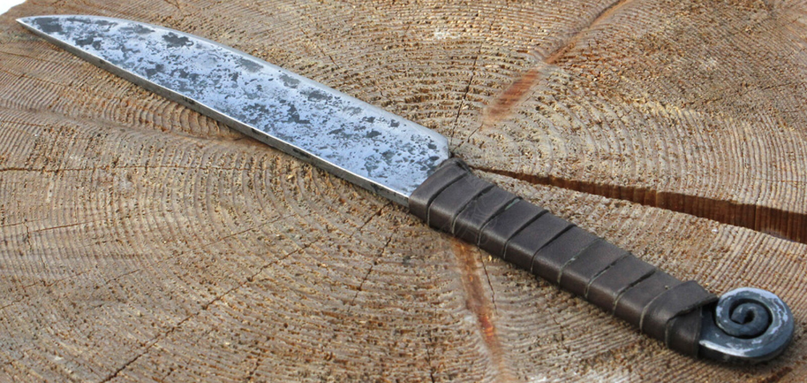 Handgeschmiedete Messerreplik eines archäologischen Fundes aus der Eisenszeit . Voll durchgehende Angelklinge. Der Griff ist mit festem Rindsleder umwickelt. Hergestellt aus Kohlenstoffstahl (nicht rostfrei). Weitere Produktinformationen ...