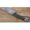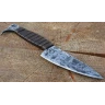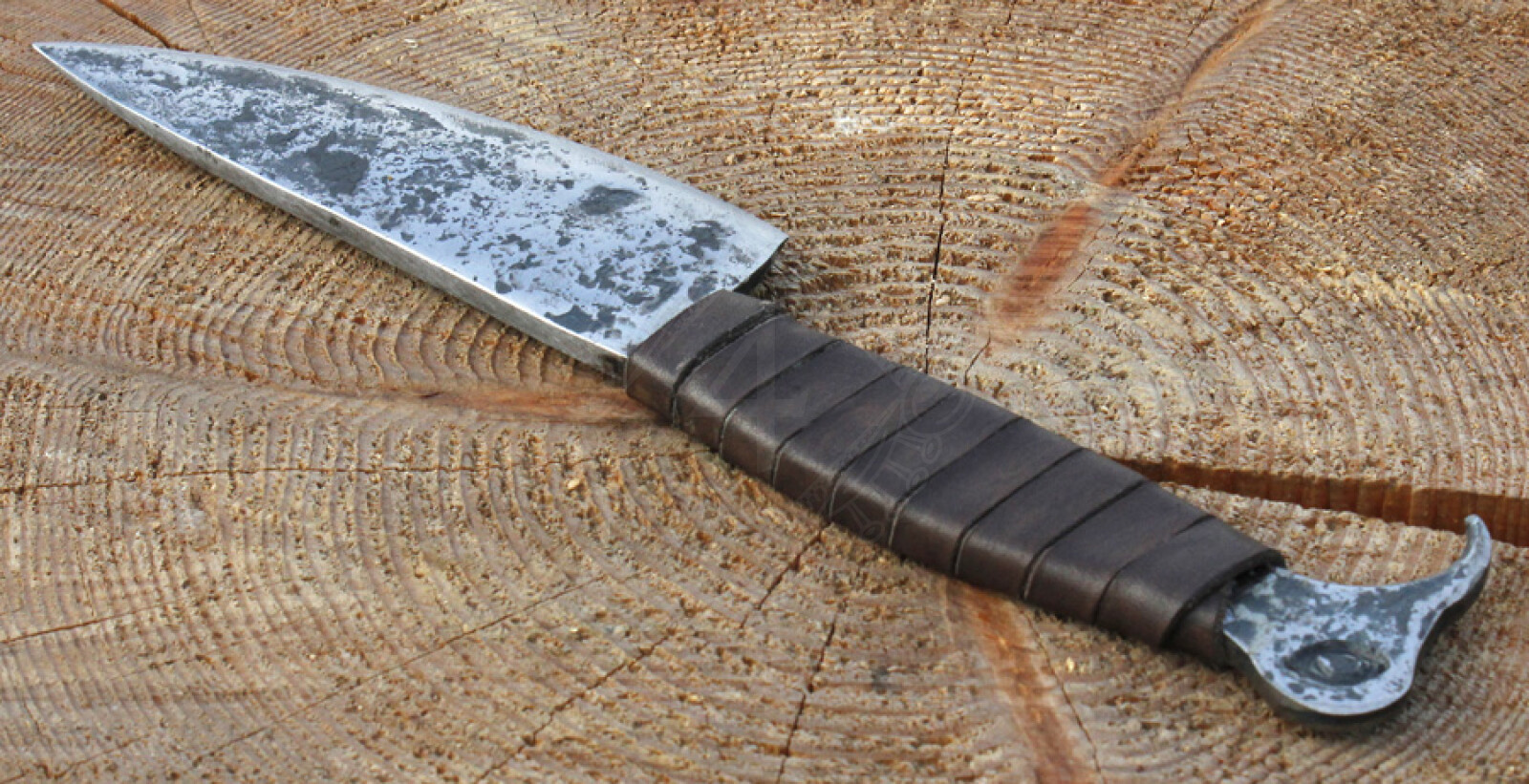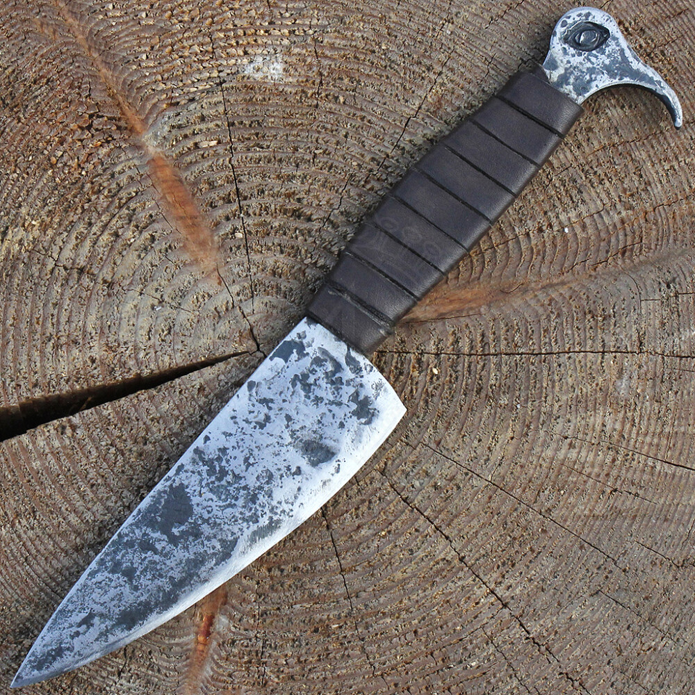 Das Messer besticht durch seine Vollerl-Konstruktion (durchgehende Angel), die ihm außergewöhnliche Stärke und Haltbarkeit verleiht. Die Klinge ist aus Kohlenstoffstahl gefertigt, einem Material, das den historischen Verfahren treu bleibt. Sie behält bewusst ein raues, unbearbeitetes Aussehen mit einer Patina, die den Eindruck eines jahrhundertealten Artefakts erweckt. Der Griff ist fest mit hochwertigem, dunklem Leder umwickelt, das einen sicheren und komfortablen Halt bietet. Das dominierende Merkmal ist zweifellos der Metallknauf in Form eines Rabenkopfes mit einem fein gearbeiteten Augendetail.