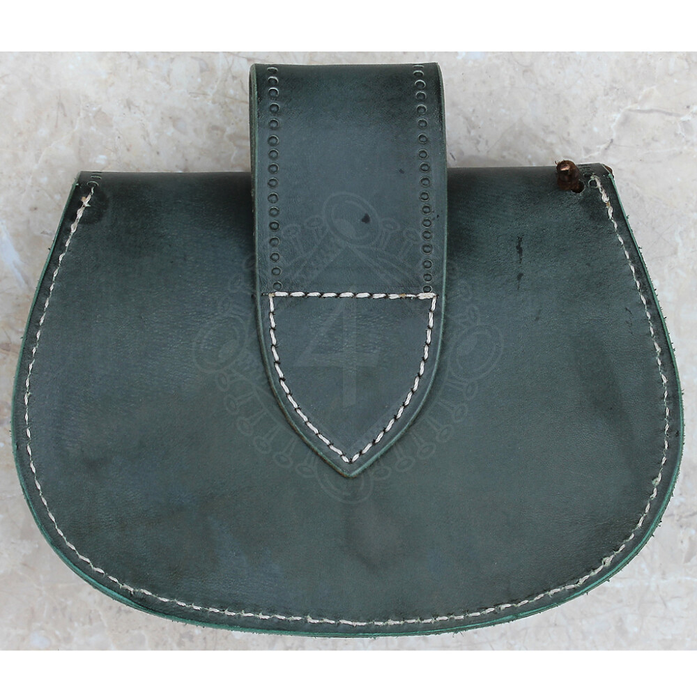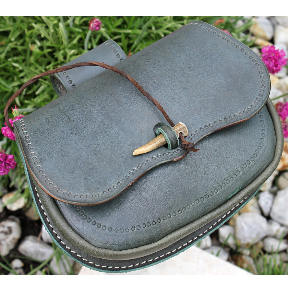 Eine einfache, jedoch stillvolle Tasche für alles, was man damals brauchen konnte. Sie stammt ca. vom 11. Jahrhundert. Die Frühmittelalterliche Tasche Sans ist aus Rindsglattleder mit einer Stärke von 2-3mm hergestellt. Sie wird am Gürtel mittels einer breiten Schleife gehängt getragen. Als Verschluss der Taschedient das Ende eines echten Geweihs. Am gesamten Umfang der Klappe ist eine Verzierung nach historischen Vorlagen angebracht. Für ihr Aussehen und zeitgenössische Optik ist sie unter Living History Fans sehr gefragt. Weitere Produktinformationen ...