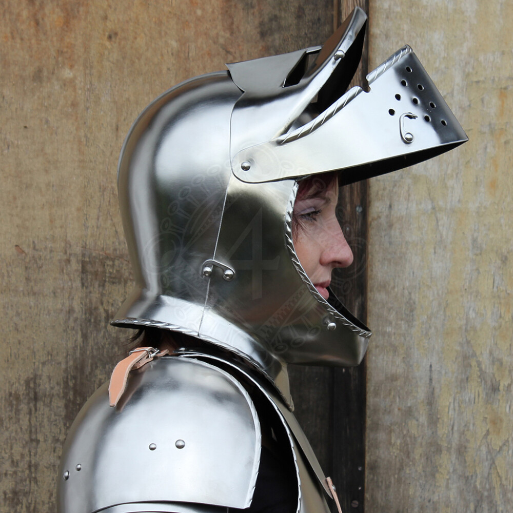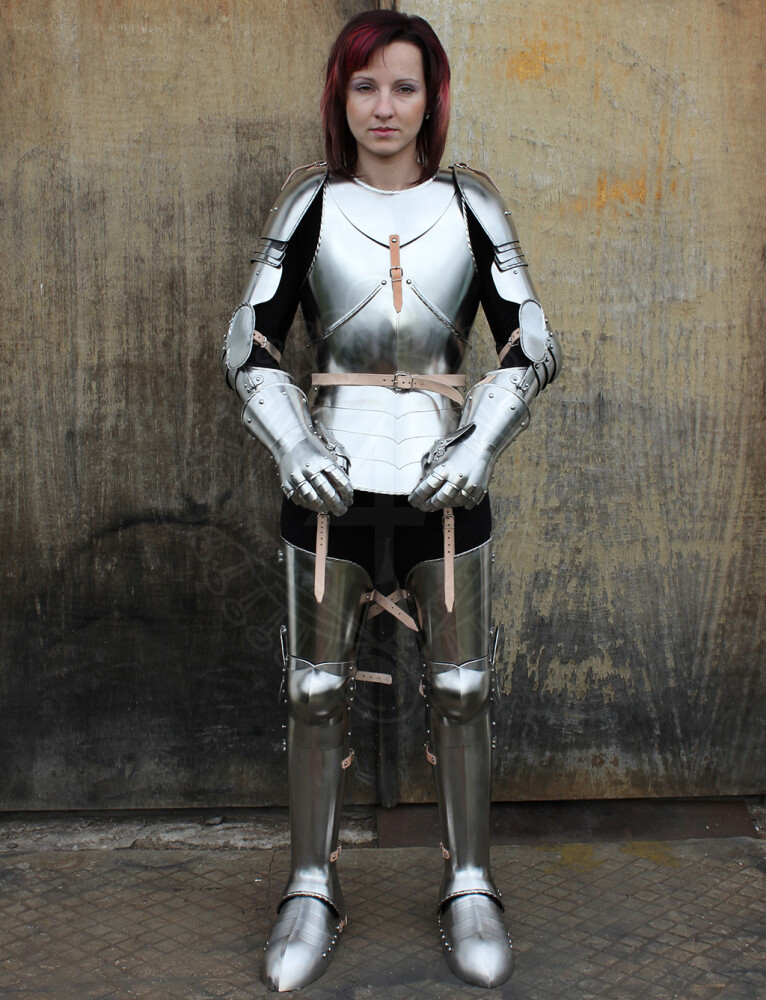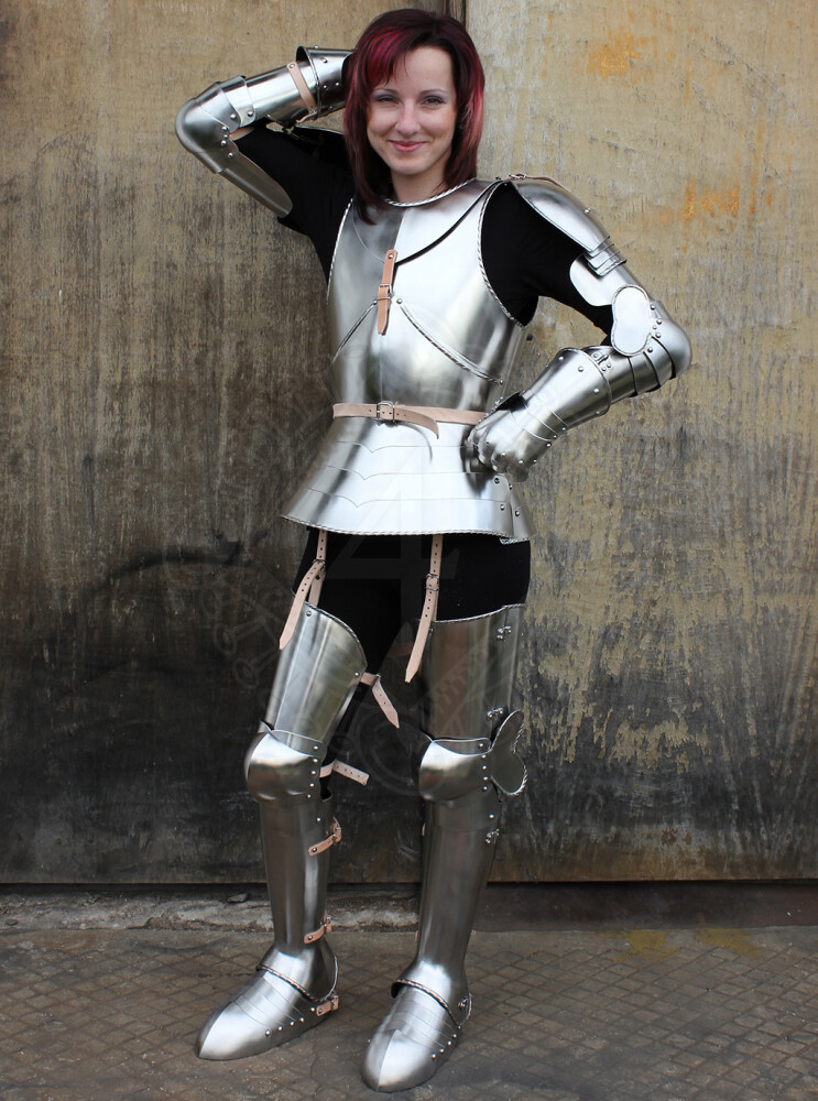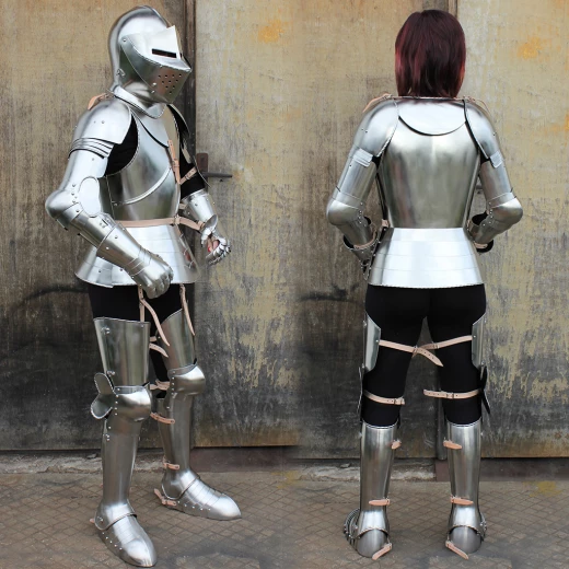 - Die Frauenrüstung besteht aus folgenden Teilen: Armet Helm, Armzeug, Panzerhandschuhe mit Fingern, Brustpanzer mit Rückenplatte, Beinzeug und Eisenschuhe.