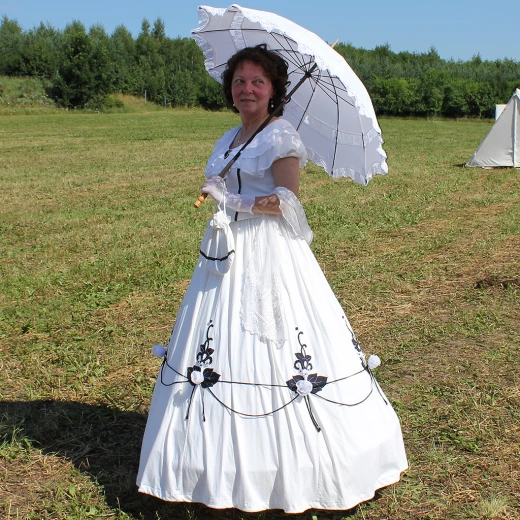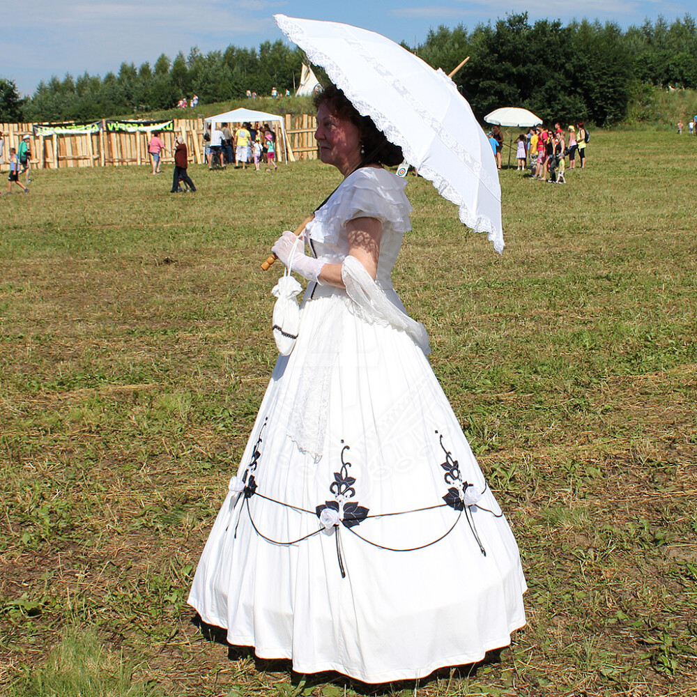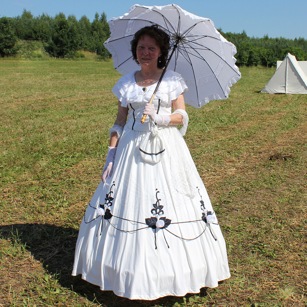Ein leichtes Spazierkleid aus der Zeit des amerikanischen Bürgerkrieges, sehr elegant. Im unteren Drittel des breiten Rocks befinden sich Applikationsarbeiten - Blüten. Unter der Kleidung wurde früher eine Krinoline getragen. Um den Ausschnitt sind Volants in zwei Reihen angebracht. Zur Damenkleidung Lucrezia wird ein Beutel für Kleinsachen und ein Chiffonschal mitgeliefert.