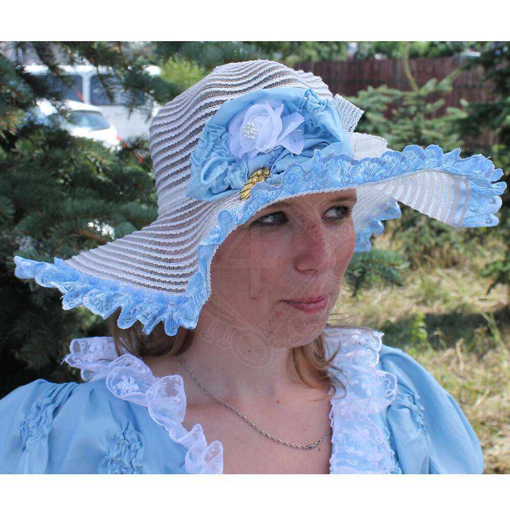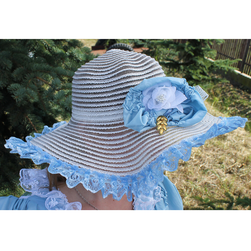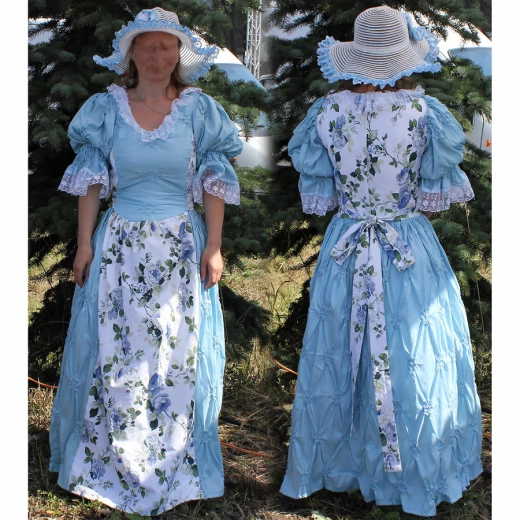 Dieses Kleid Amalia ist aus blauem Taft genäht. Das Baumwollmieder mit Blumen hat einen Tafteinsatz im Vorderteil. Aus dem Mieder fällt locker ein breiter Taftrock mit einem Einsatz aus Blumenstoff. Die bauschigen Ärmel sind an den Oberarmen mit einem Gummiband versehen und mit Spitze beendet. Der Strohhut ist mit Spitze und Taftblume verziert. Weitere Produktinformationen ...