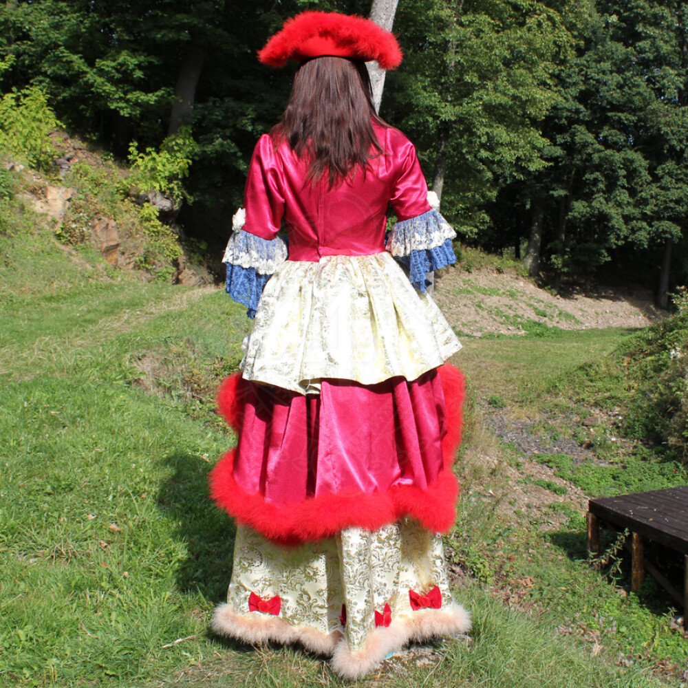 Diese Robe mit edlem Dekolleté hat verzierte Planchette ein der Spitzenform. Sowohl der obere als auch der untere Rock sind mit Federrand gesäumt. Die Ärmel sind mit reich geraffter Spitze in zwei Reihen verziert. Diese protzige Robewird von einem Dreispitz mit Federrand und einer Fächer ergänzt. Weitere Produktinformationen ...