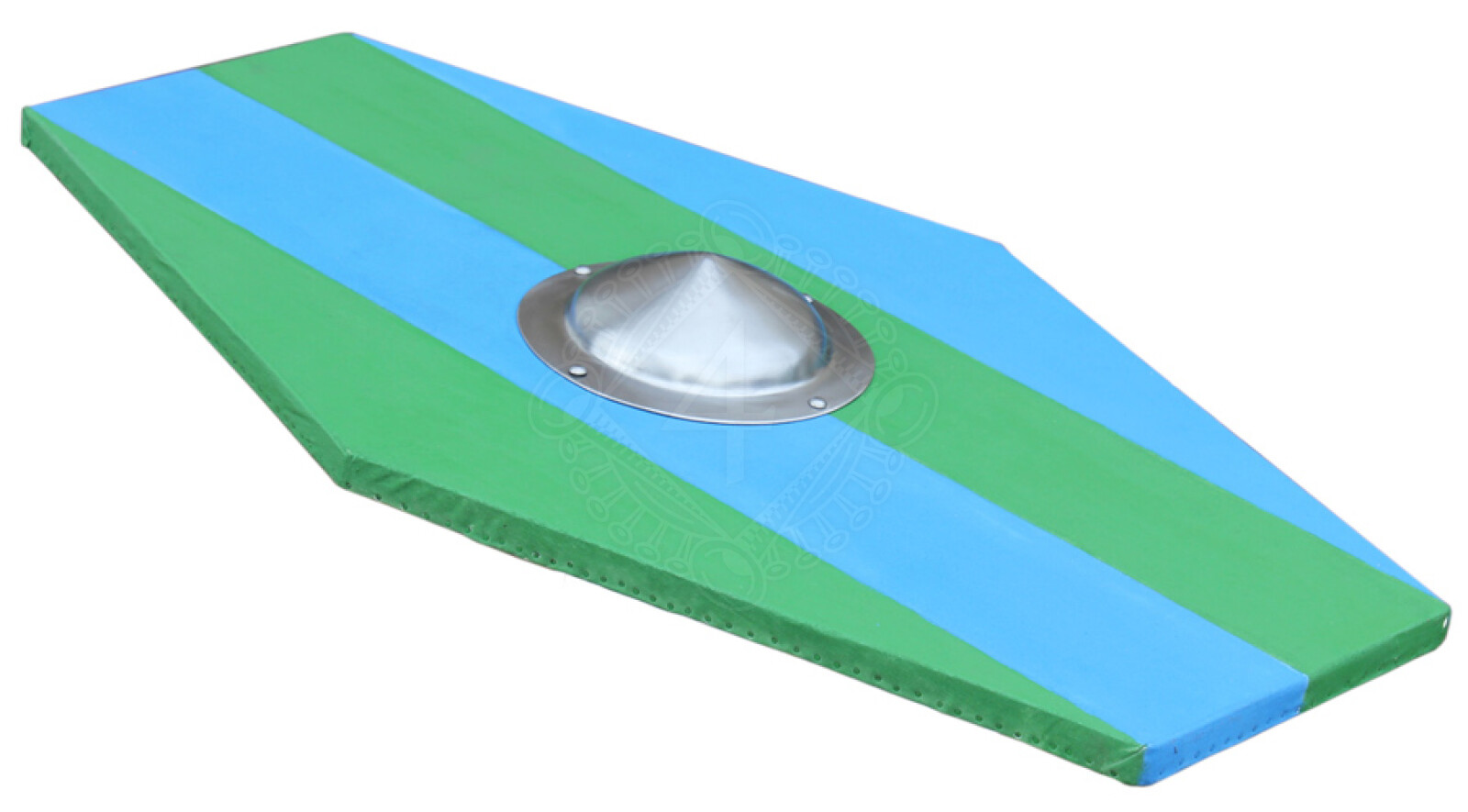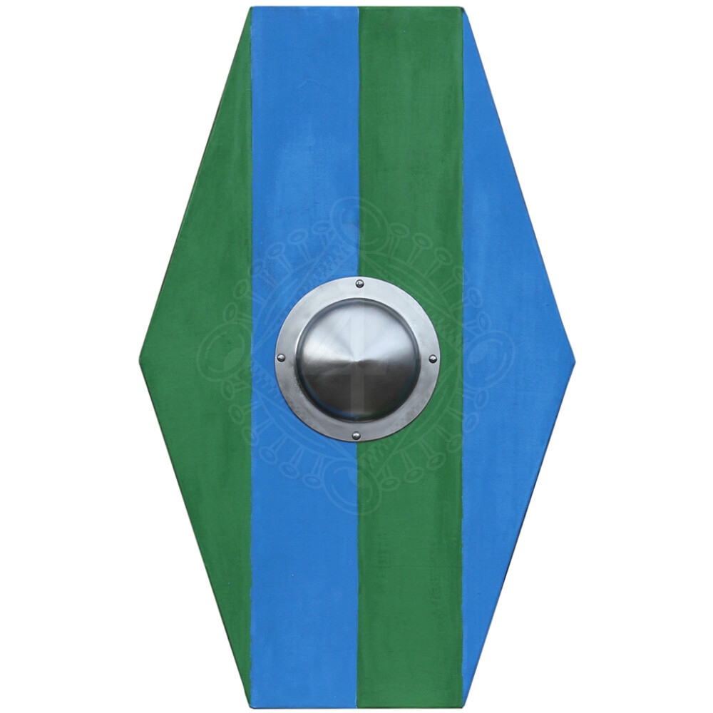 Manche Re-encators sagen, dass sich die sechseckigen Schilde mehr für individuelle kämpfen eignen, da sie eine gute Verteidigung gewährleisten, sind aber nicht ganz so gut für Bildung der 'Schildwand'. Dies macht Sinn, wie die früheren germanischen Stämme mehr Scharmützler und individuelle Kämpfer waren, während in der Migrationszeit im frühen Mittelalter die "Schildwand"-Taktik immer beliebter wurde. Der Germanische Schild ist aufgebaut aus aneinandergeleimten Holzbrettern die mit Leinen bespannt sind. In der Mitte des Schildes ist ein eiserner Schildbuckel, der die Hand des Kriegers schützt. Auf Wunsch kann der Schild mit einem eisernen Rand versehen werden.