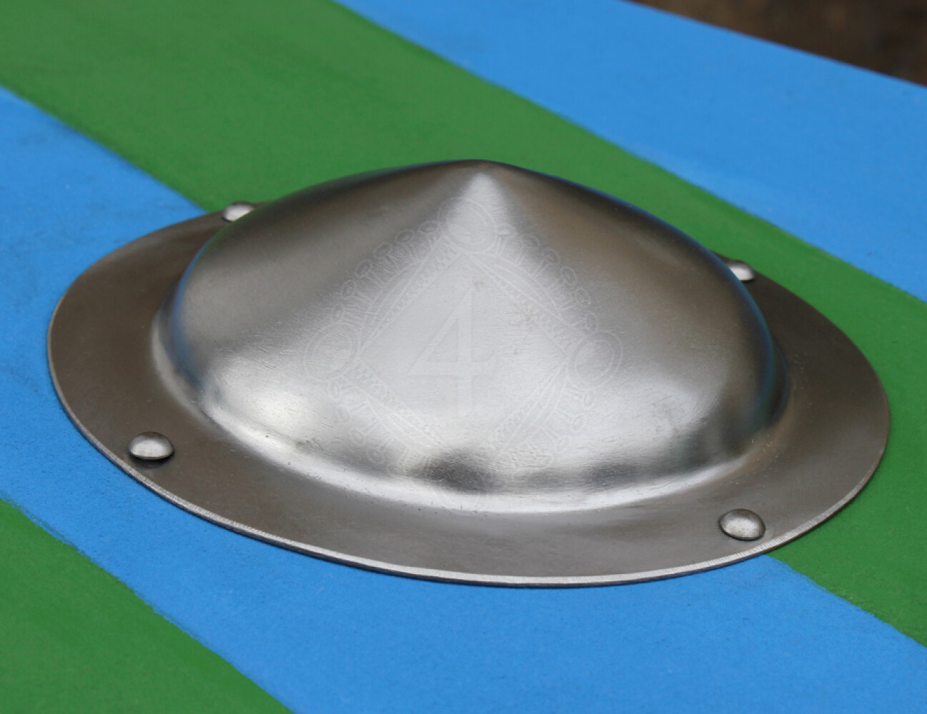 Die Schilde waren für die Germanen sehr wichtige defensive Waffen, vor allem vor der Migrationszeit. Da sich die meisten germanischen Krieger weder einen Helm oder Kettenhemd leisten konnten, bot ihnen der Schild den einzigen Schutz den sie in der Schlacht hatten und war zur Not auch als Angriffswaffe einsetzbar. Viele Schilde wurden von den Archäologen in dem Hjortspring Moor in Dänemark gefunden. Sehr häufig hatten Sie sechseckige Form, einige hatten aber auch ovale Form. Sie waren aus Holz und hatte einen Schildbuckel, der sich dem La-Tene Buckel ähnelt. Die germanischen Schilde waren mit verschiedenen bunten (Kriegs-)Farben individuell bemalt. Wir können diesen Schild nach Ihrer eigenen Vorlage auf Anfrage bemalen. Weitere Produktinformationen ...