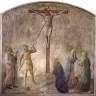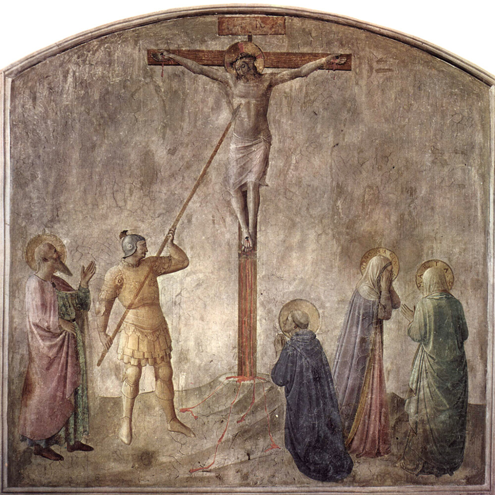 Der letzte unserer illustrativen Bilder ist eine Kopie des Freskos von Fra Angelico, aus dem Dominikanerkloster in San Marco. Es zeigt die Kreuzigung Christi mit Lanzenstich 89des Hauptmanns Longinus, Fresko von Fra Angelico (um 1437–1446).