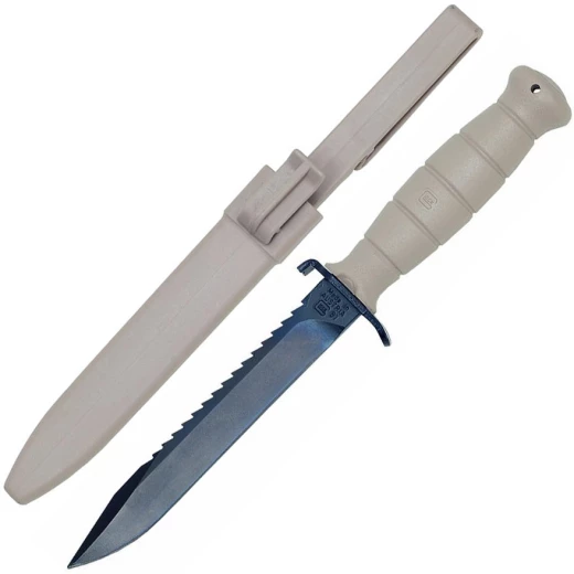 Die Klinge ist aus rostträgem Federstahl mit einer Härte von HRC55, die genaue Zusammensetzung ist allerdings ein gut gehütetes Betriebsgeheimnis. Als Reflektions- und Rostschutz ist die Klinge schwarz phosphatiert. Die Scheide und der Griff aus bewährtem Glock-Polymer sind nahezu unverwüstlich. In jeder Situation sicher gehalten wird das Messer mit einem simplen, aber wirkungsvollen Clipverschluss. Beim Ziehen des Messers wird dieser einfach mit dem Daumen entriegelt.