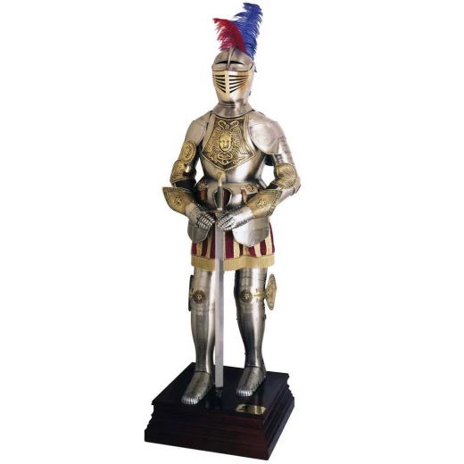 - Komplettes Set: Im Lieferumfang enthalten sind ein geschlossener Helm (Armet) mit farbigen Federbuschen, ein Zweihandschwert, das der Ritter in seinen Handschuhen hält, und ein massiver Sockel aus poliertem Hartholz.