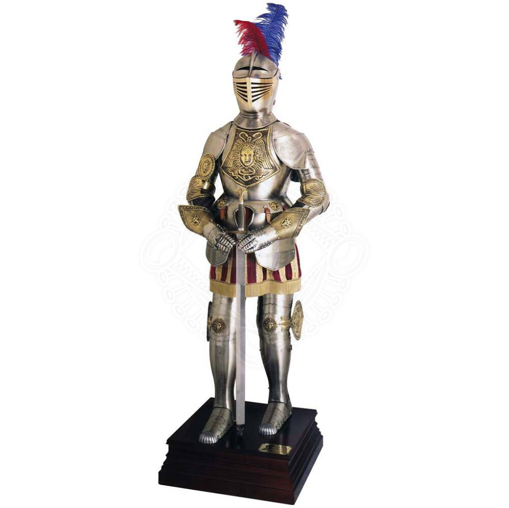 - Material und Ausführung: Die Rüstung ist aus starkem Stahl mit polierter Oberfläche gefertigt. Alle Teile sind voll beweglich, was ihre Authentizität unterstreicht.