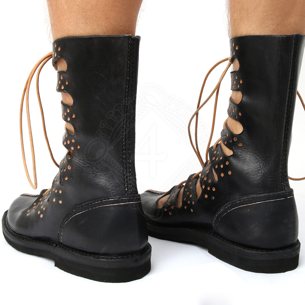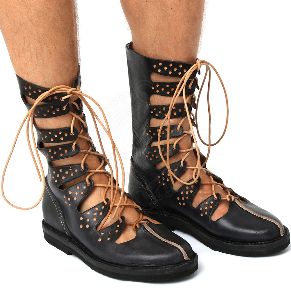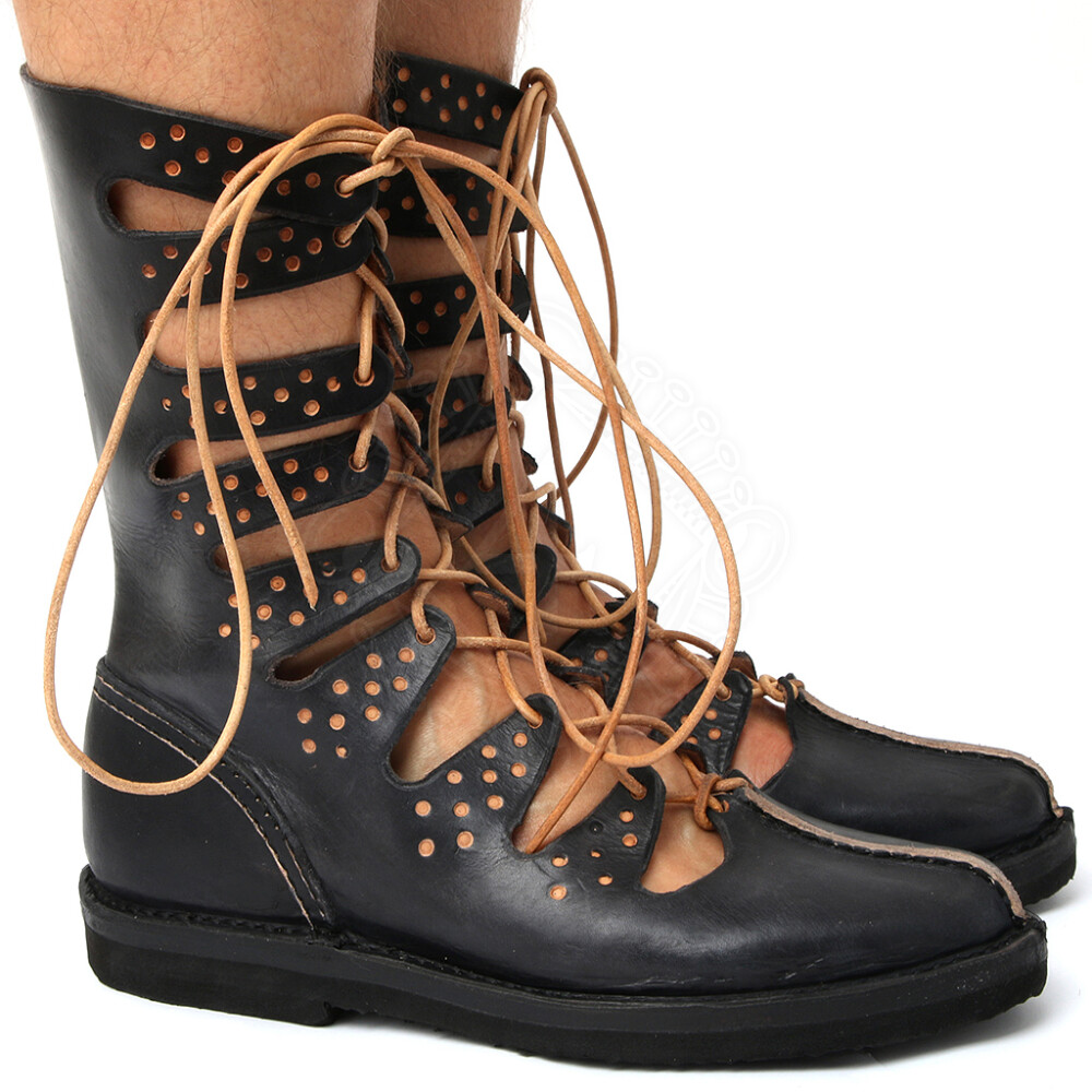 Das Oberleder der gallischen Schuhe besteht aus echtem, ca. 2mm starkem, Rindleder hergestellt. Für eine lange Nutzungsdauer ist das Leder mit Palmöl, tierischem Fett und Bienenwachs behandelt. Die Innensohle ist aus 4mm starkem, gewalztem Rindsleder gefertigt. Die Laufsohle ist aus spezieller poriger Gummi. Für ein angenehmes Gefühlt beim Gehen ist die Fußsohle mit Absatz ausgestattet. Diese Schuhe werden in Tschechien individuell auf eine traditionelle Art und eise hergestellt. Es handelt sich weder um Massenproduktion, noch um Billigimport aus Asien.