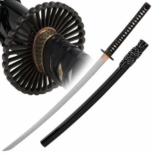- Schwarze, hochglanzlackierte Scheide aus Holz (Kuroro-Stil) mit Abschlüssen aus (Kojiri, Kurigata, Koiguchi) aus Büffelhorn.
