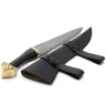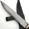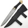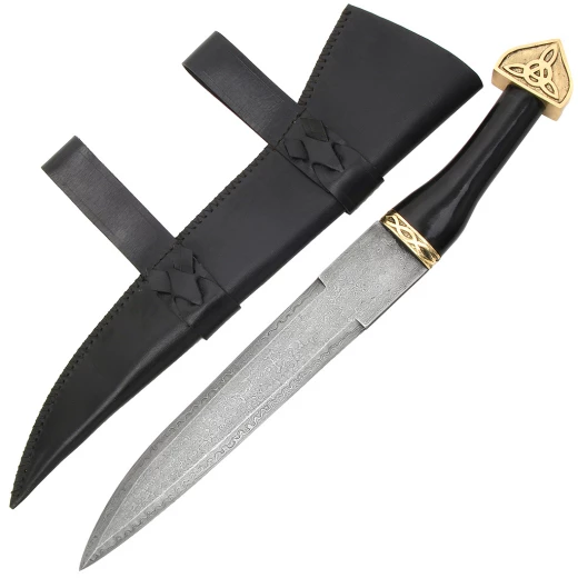 Sax mit schwarzer Lederscheide und Horngriff, aus dem 9. Jahrhundert. Klinge ist handgeschmiedet aus Kohlenstoff – Damaszenerstahl. Griff aus echtem Horn mit aufwendig verziertem Knauf. Weitere Produktinformationen ...