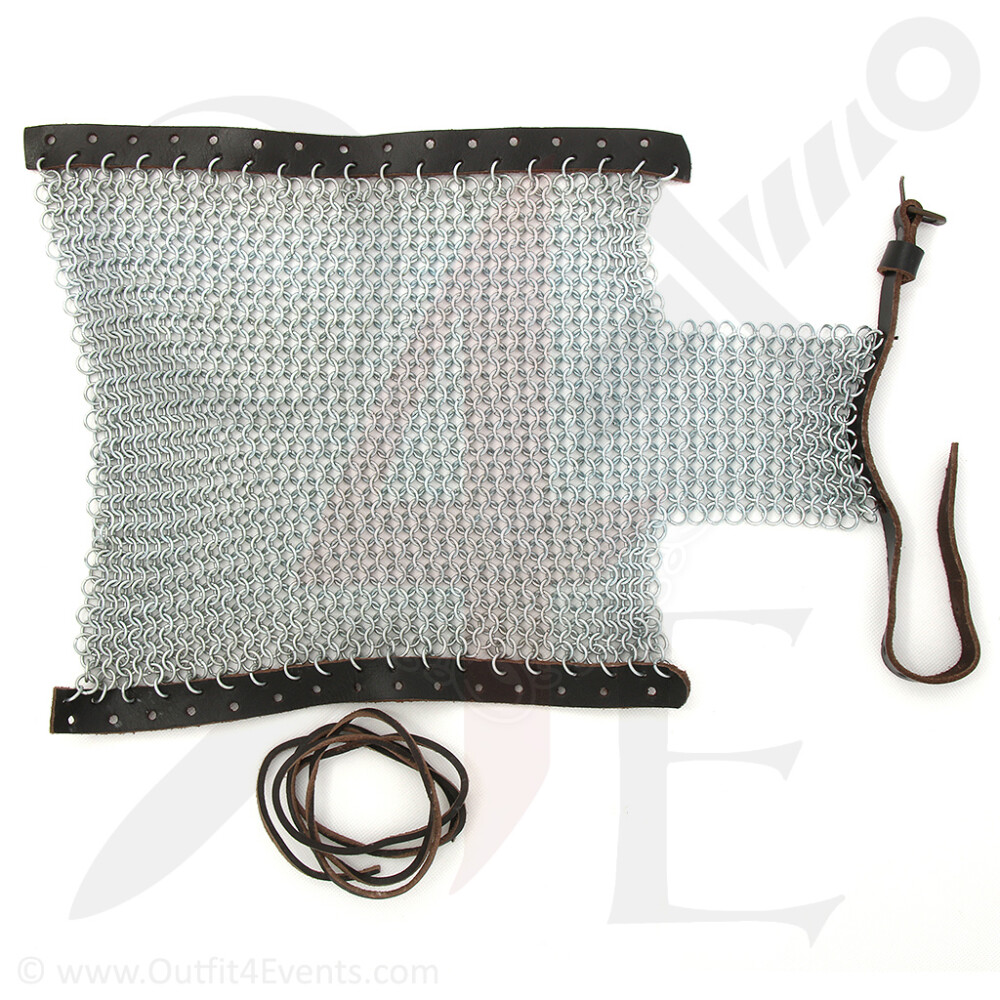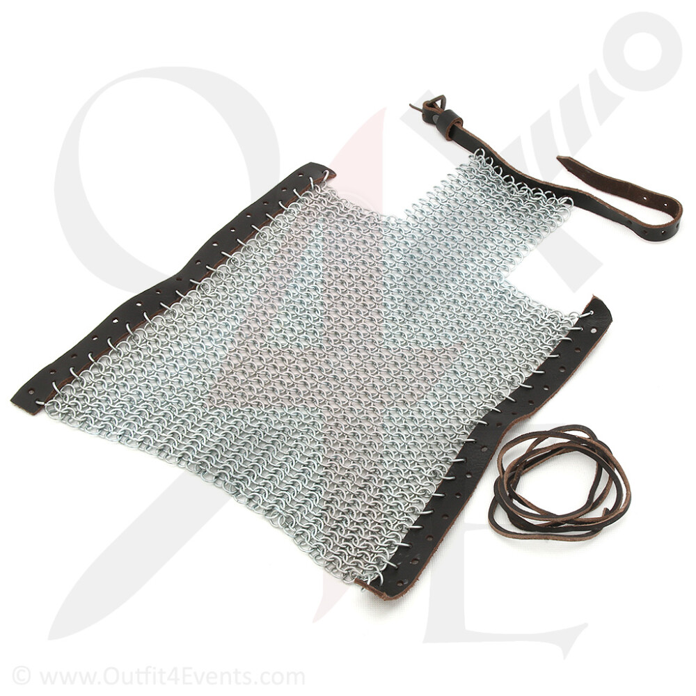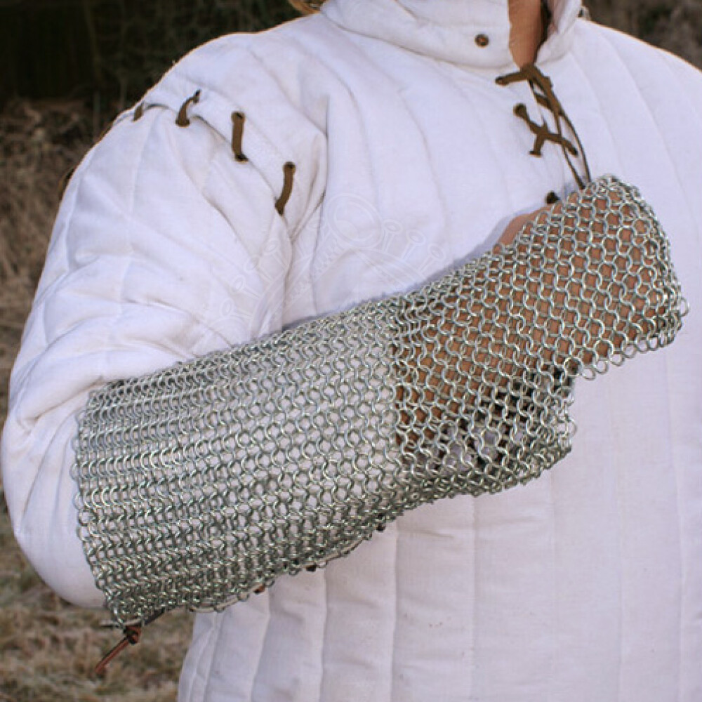 Armschützer aus verzinktem, unvernietetem Kettengeflecht (BMSZ). Rückseitig ist das Geflecht mit zwei Lederstreifen verwoben. Mit dem Lederband kann man den Armschützer individuell auf Maß schnüren. Das Kettengeflecht reicht bis über den Handrücken. Am Ende ist dort ein weiterer Lederriemen mit Messingschnalle angebracht. Weitere Produktinformationen ...