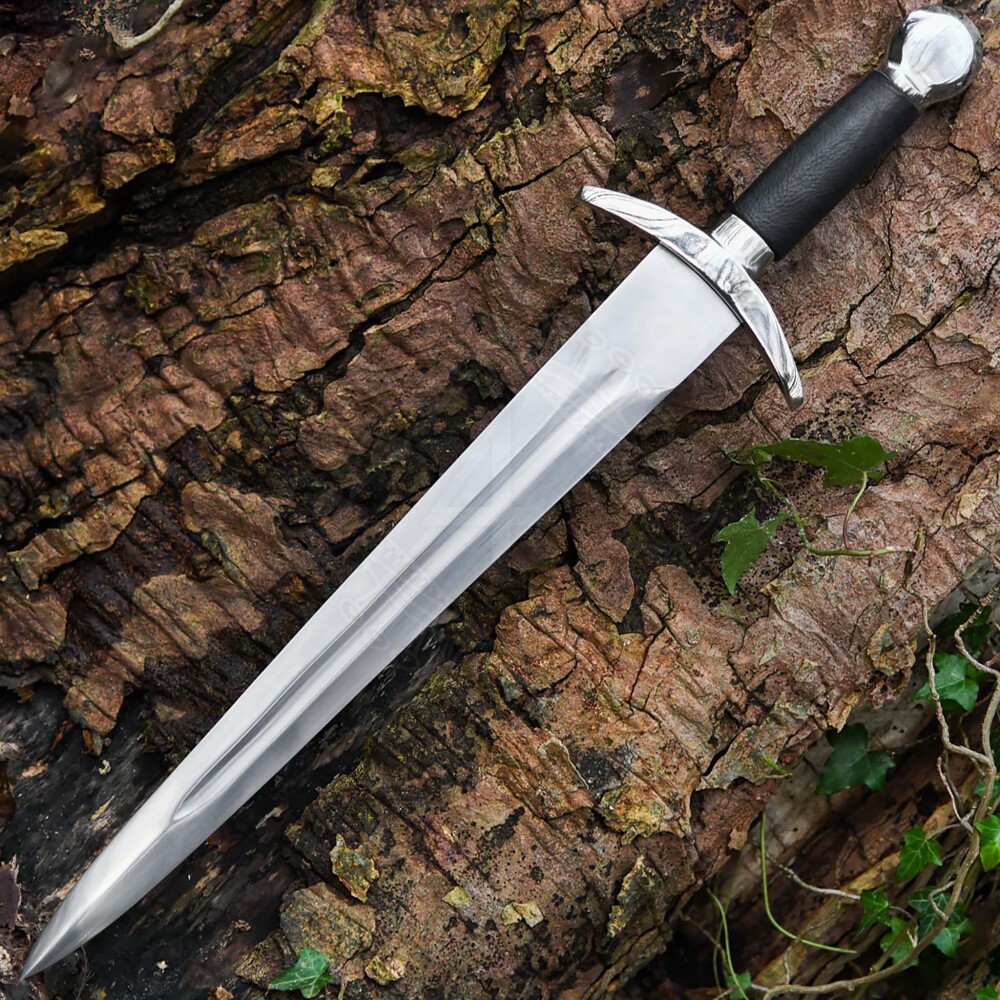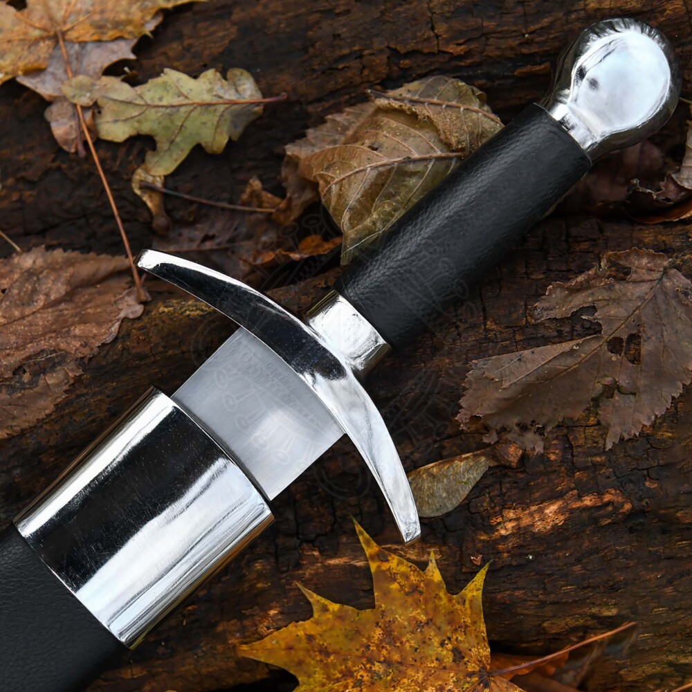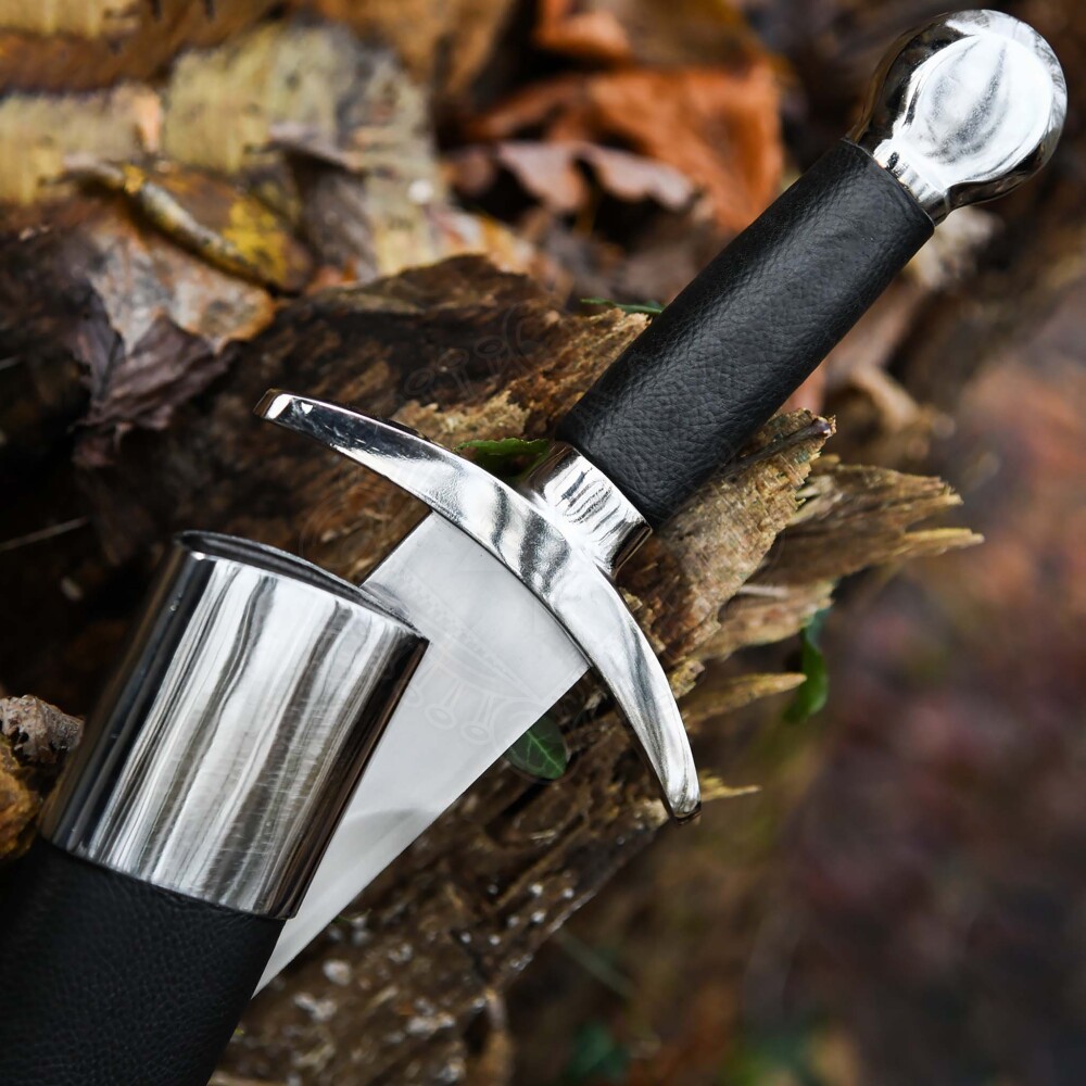 Das Herzstück dieser Blankwaffe ist die breite, handgeschmiedete Klinge, die mit einer markanten Hohlkehle (Blutrinne) versehen ist. Diese reduziert das Gewicht und verleiht der Klinge ihr typisches, historisches Profil. Der Griff besteht aus robustem Hartholz und ist für einen sicheren und rutschfesten Halt sorgfältig mit Leder umwickelt. Ein besonders spannendes Konstruktionsmerkmal ist der Knauf: Er wurde am Griffende doppelt mit der Klingenangel verschraubt, was der gesamten Konstruktion zusätzliche Stabilität verleiht. Die kräftige, leicht gebogene Parierstange schützt deine Hand zuverlässig vor dem Abrutschen auf die Schneide. Die mitgelieferte Scheide ist ebenfalls mit Leder bezogen und verfügt über ein glänzendes Ortband sowie ein passendes Mundblech aus Metall.