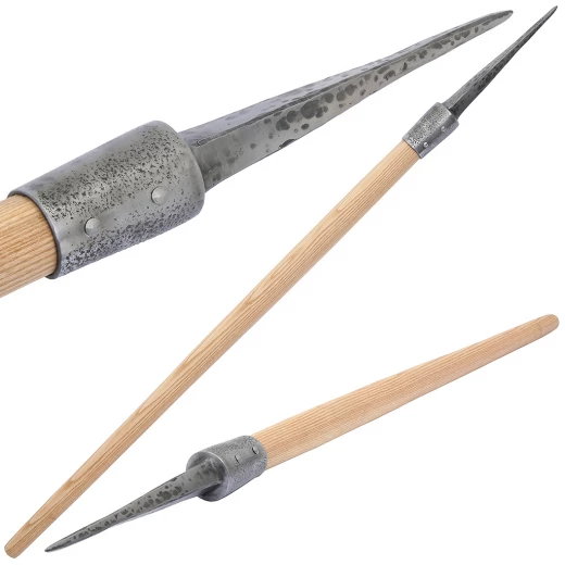 2xDer Goedendag ist eine Stangenwaffe (dicker an der Spitze, verjüngt sich zum unteren Ende) mit einer Stahlspitze mit quadratischer Basis, die in einem Stahlring verankert ist. Unsere Rekonstruktion geht aus Fotos der archäologischen Funde. Weitere Produktinformationen ...
