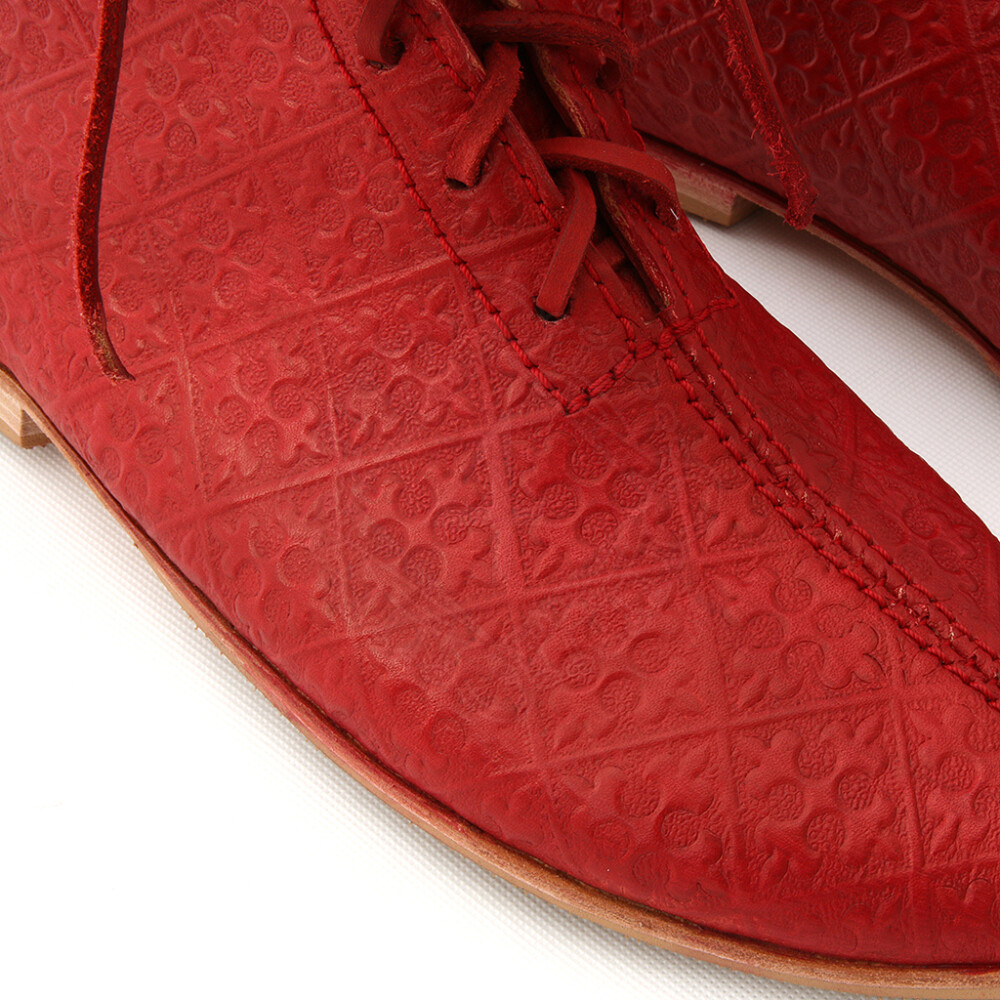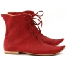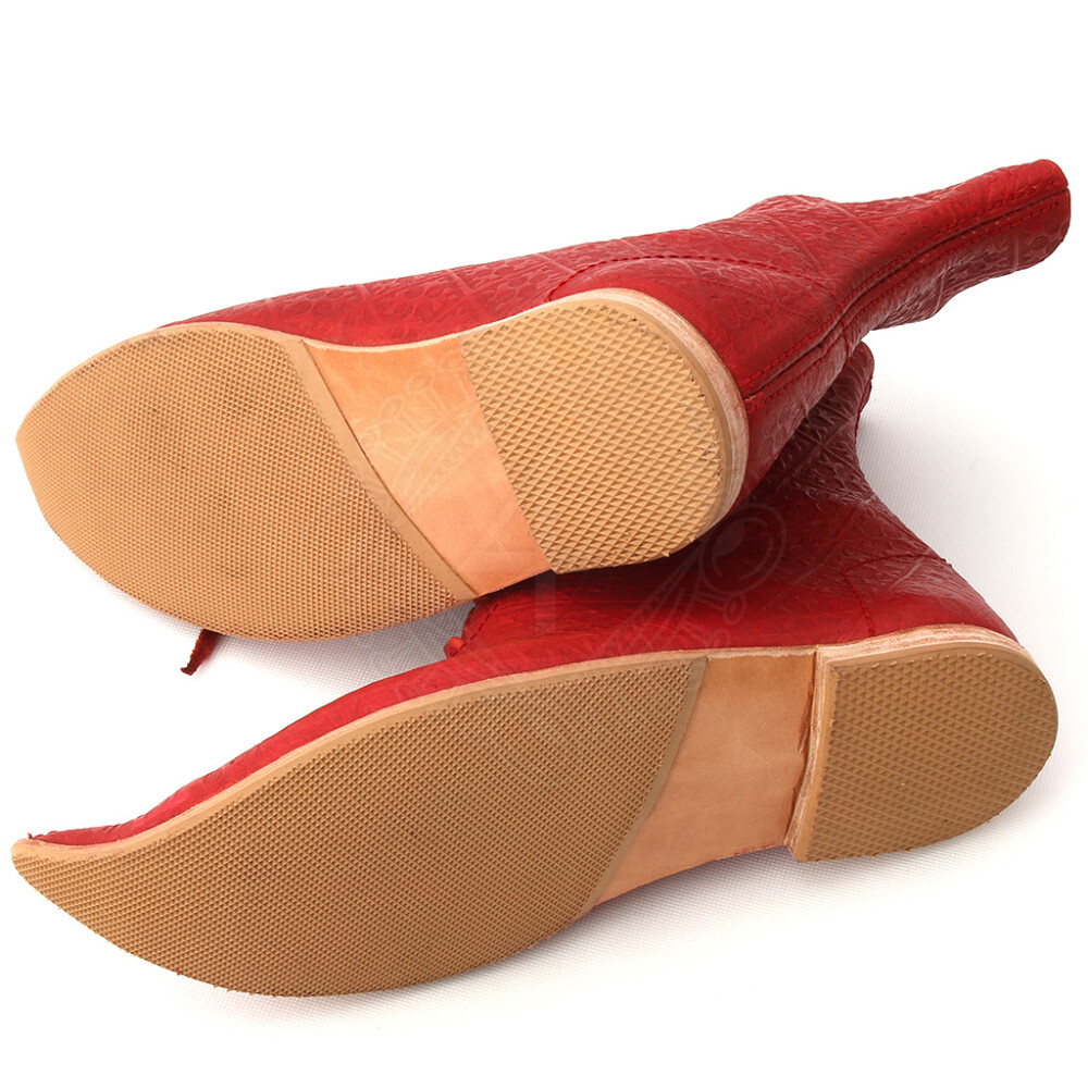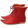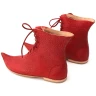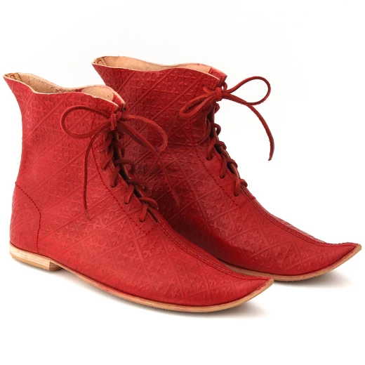 Nach der Form der Schuhspitze passt dieses Schuhmodell in die Zeit ab zweiter Hälfte des 14. Jahrhunderts bis zu Beginn des 15. Jahrhunderts. Die Schuhe sind gezwickt und ihr Schaft ist mit Kreuz-Prägung verziert. Die Ledersohle ist mit dünnem rutschfestem Gummi versehen. Neben dem Dandy vom Hof würden diese hochgotischen Schuhe sehr schön auf den Füßen von einem hochrangigen Prälat aussehen. Die rote Farbe war im Mittelalter sehr selten und kostbar, wenn sie Ihnen aber trotzdem zu wenig prächtig scheint, können wir diese Schuhe auch in goldener Farbe auf Anfrage liefern. Weitere Produktinformationen ...