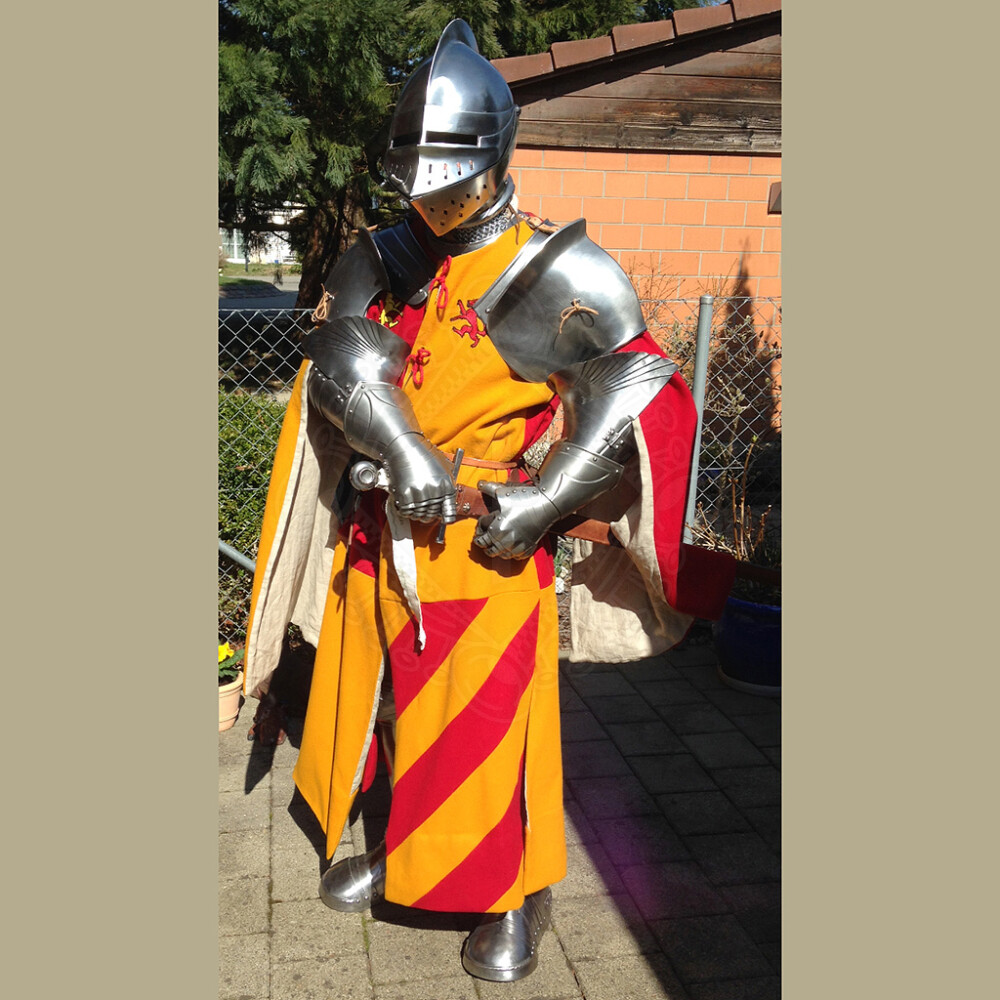 1xDieses Armzeug, wurde nach dem Süd-Deutschen Vorbild, dem Stechzeug aus dem 16. Jahrhundert entwickelt. Es wurde in einer speziellen Turnierart, genannt das Realgestech oder Plankgestech eingesetzt. Das Original der Ritterrüstung befindet sich in der Rüstkammer von Churburg. Leider besteht es aus unbeweglichen Teilen um ein brechen des Armes im Turnier zu vermeiden. Um dieses Armzeug auch im Schlachtfeld zu Fuß uneingeschränkt nutzen zu können, mußte es komplett re-designet und überarbeitet werden. Dieser schwierigen Aufgabe hat sich Herr Adrian Kunz (schweizerischer Schaukämpfer) entledigt. Tolle Arbeit, oder? Weitere Produktinformationen ...