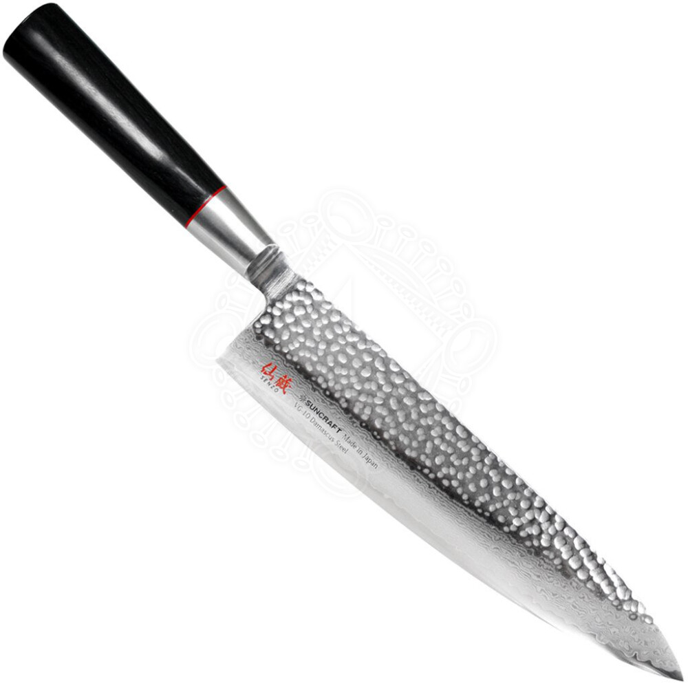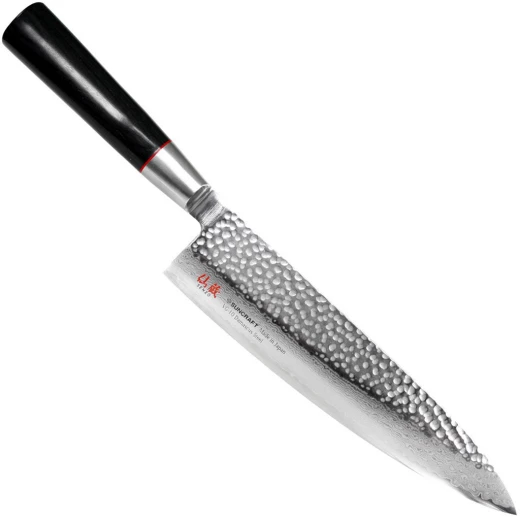Ein Japan Kochmesser nach traditioneller Art und Weise gefertigt. Die Klinge besteht aus 33 Lagen rostfreiem Damaststahl. Die Kernlage ist aus VG10 Stahl und hat eine Rockwellhärte von 60-61°. Auf beiden Seiten wird sie geschützt von einer Lage Nickel und Silber. Zusätzlich sind je 15 Lagen Damaststahllagen aufgeschmiedet. Die so aufgebaute Klinge bietet eine höchstmögliche Schnitthaltigkeit bei gleichzeitig größtmöglicher Flexibilität. Die perfekte Hochglanzpolitur, sowie ein Griffstück aus schwarzem Pakkaholz, welches durch seine Kastanienform ergonomisch in der Hand liegt, runden dieses Meisterstück optimal ab. Die Oberflächenstruktur als Hommage an die traditionellen Schmiedetechniken wird maschinell eingepresst. Weitere Produktinformationen ...