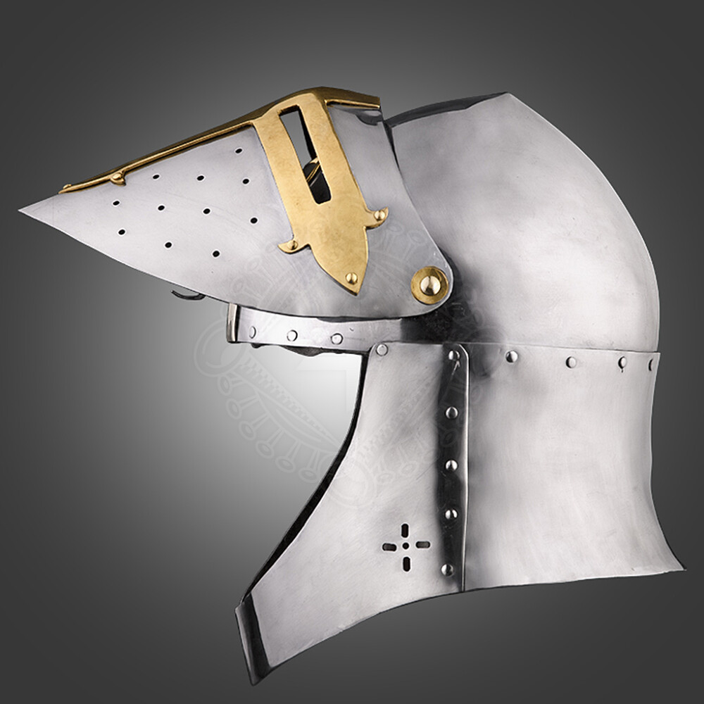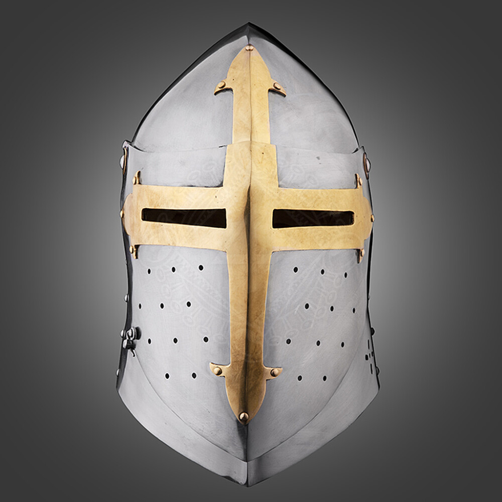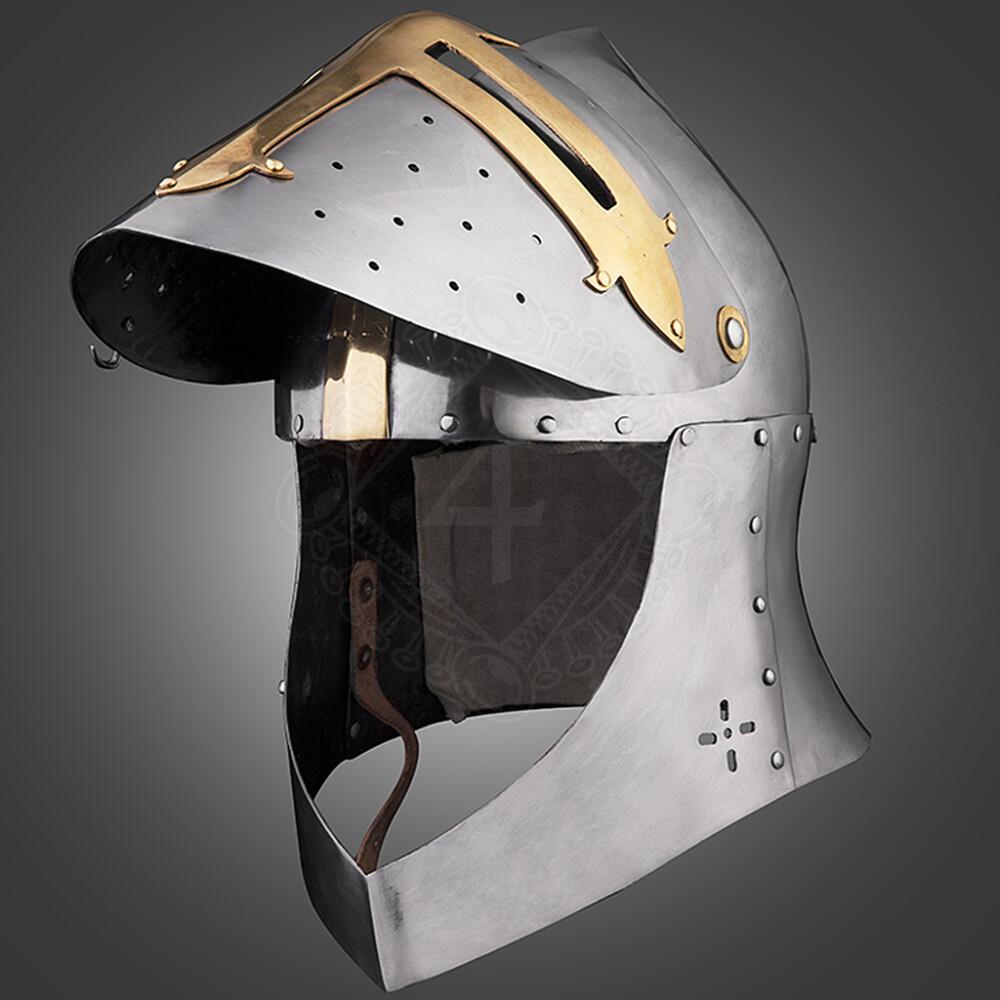 Diese Beckenhaube mit Messingkreuz auf dem Visier (genannt auch Zuckerhut) ist für Kontakt(schau)kämpfe geeignet. Der Helm ist außer dem Visier im inneren ausgepolstert. Weitere Produktinformationen ...