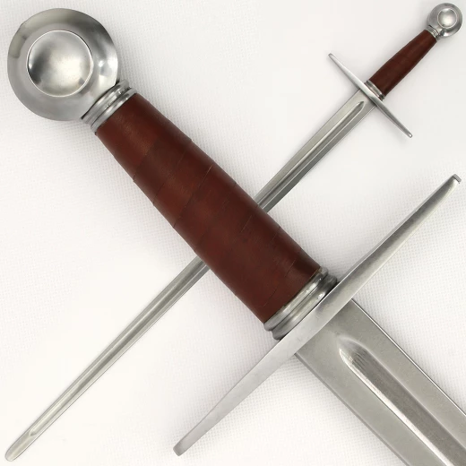 Dieses Schaukampfschwert besitzt eine schmale Klinge, einen Scheibenknauf und eine gerade Parierstange und ist zeitlich dem 13. und 14. Jahrhundert zuzuordnen. Die in Öl gehärtete Federstahlklinge ist bis zum Knauf durchgeschmiedet und am Griffende vernietet. Sie besitzt eine ausgeprägte Hohlkehle, welche dem Schwert hervorragende Fechteigenschaften bietet. Die Klingenangel ist mit Hartholz belegt und mit echtem Leder umgewickelt. Die Parierstange und der Knauf sind aus Stahl. Sowohl die Klingenschneide, als auch die Schwertspitze ist stumpf und abgerundet. Weitere Produktinformationen ...
