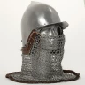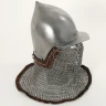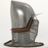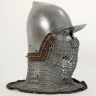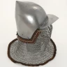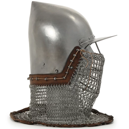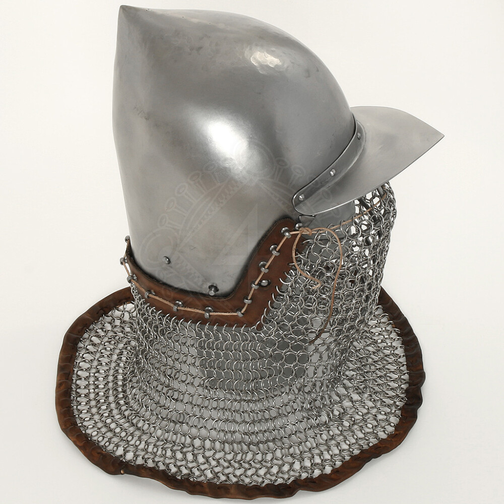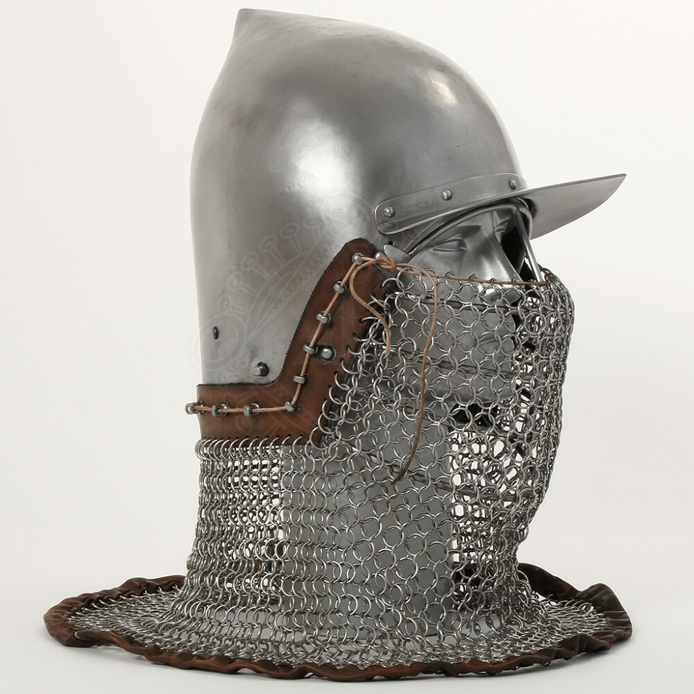 Unsere Beckenhaube mit Schutzschild ist von einem Original inspiriert, das im Musée de Valere, Sion, aufbewahrt ist. Datiert ist es 1380-1400. Ähnliche Modelle der Beckenhaube wurden in archäologischen Ausgrabungen des 14. Jahrhunderts entdeckt. Doch nur wenige Miniaturmalereien bestätigen die Nutzung solcher Helme von mittelalterlichen Kriegern. Der Schild ist wahrscheinlich eine spätere Ergänzung. Die Gesichtsöffnung wird mit dem Gittervisier (sog. Fischgräte) geschützt, das mit der Helmglocke mittels vier Zapfen verbunden ist. Das Gittervisier ist abnehmbar. Der Schild mäßigt die Schlagkraft der gegen den Kopf gerichtet Schläge. Die optionale Kettenbrünne schützt das Gesicht zusätzlich und deckt den Hals perfekt. Weitere Produktinformationen ...