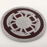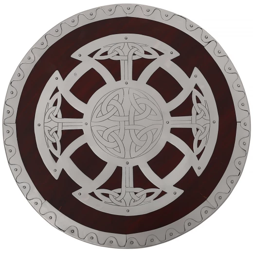 Schaukampftauglicher Rundschild aus Holz mit starken Stahlbeschlägen. In der Mitte wurde ein typisches, sehr kunstvolles Knotenmuster in eine Stahplatte aufwendig in Handarbeit eingemeißelt. Rückseitig ist eine mit weichem Leder bedeckte Polsterung angenietet. Ebenfalls sind zwei Ledergurte angenietet. Der eine lang und verstellbar zum Tragen am Arm oder auf dem Rücken. Weitere Produktinformationen ...